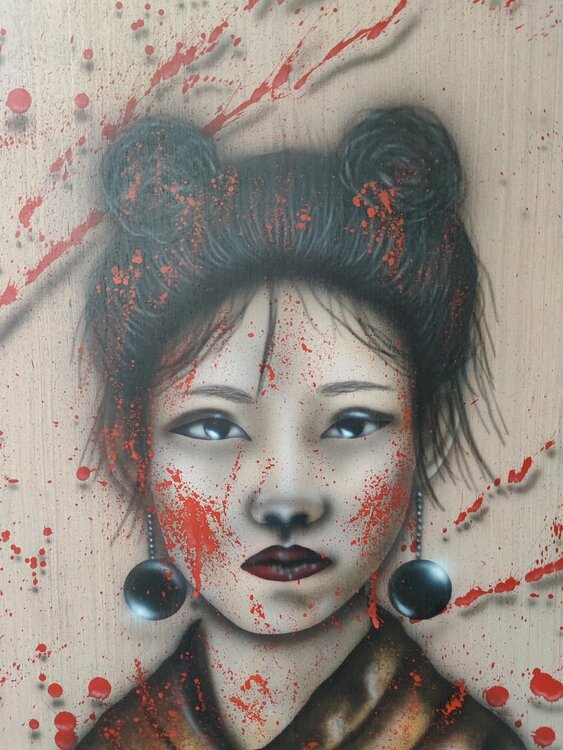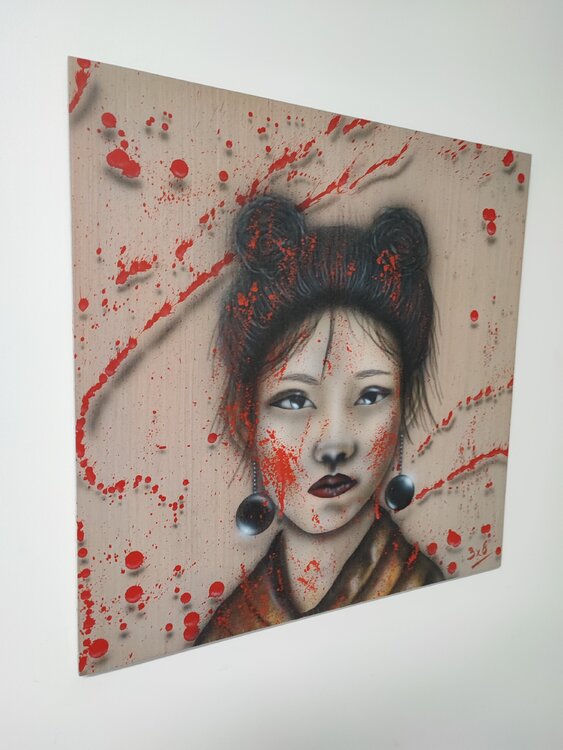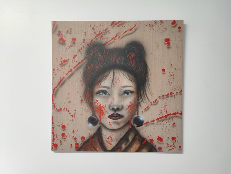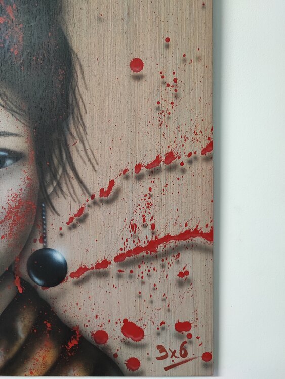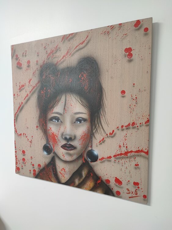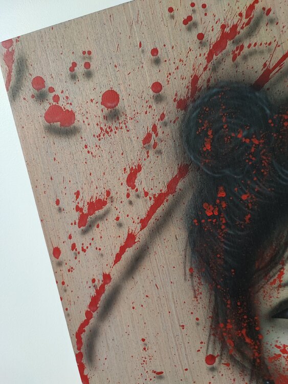 Obra realizada con aerógrafo y aerosol, sprays 3D sobre madera con acabado de barniz satinado.