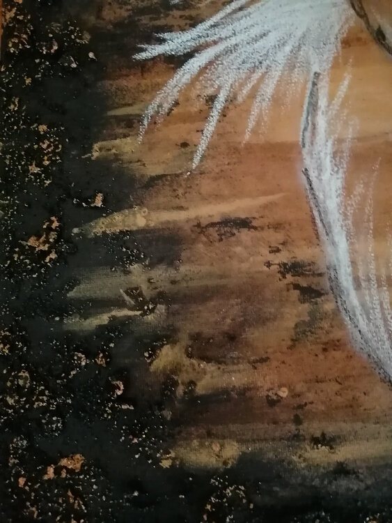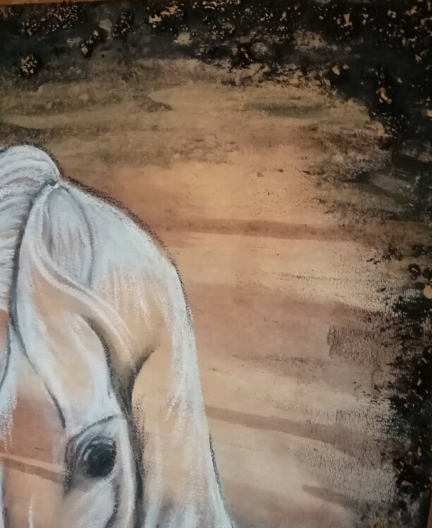 A pesar del "dramatismo" del fondo con sus texturas y esos colores que pesan se ha obtenido la claridad con lo blanco de ese caballo en primer plano y aunque mantiene una transparencia en su conjunto lo hace definido a la vista y está todo1