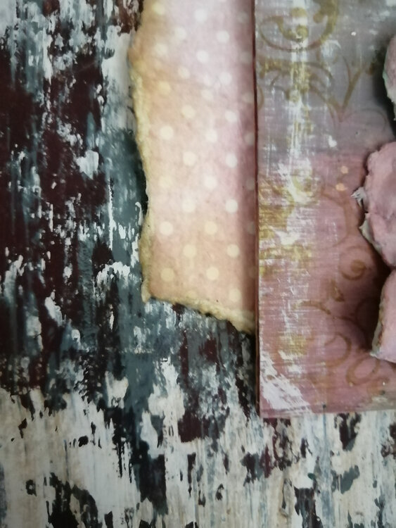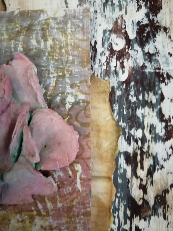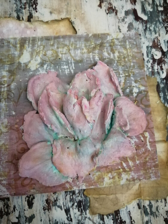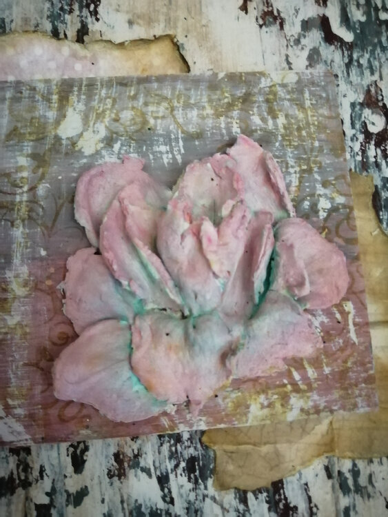 Cuadro con relieve con tecnica de efecto pintura descascarillada en el fondo y Flor realizada con pasta dd modelar y pintura acrílica