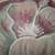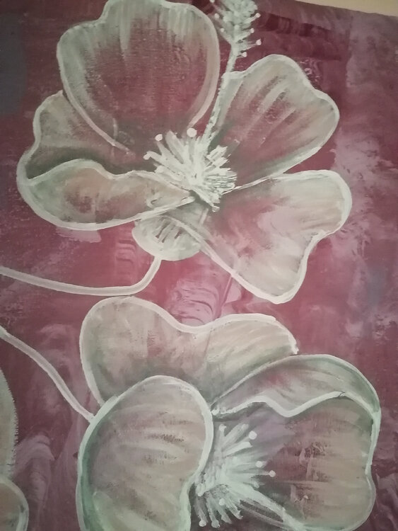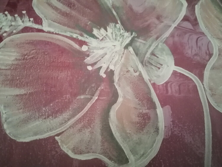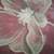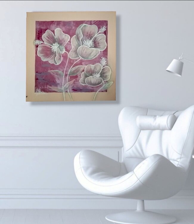 Sobre un fondo en tonos rosa y violetas se pueden aprdciar flores en negativo, como suelen ser la mayoría de las figuras de sus cuadros, pero esta vez ha creado la ilusión de un marco sin abarcar la totalidad del lienzo