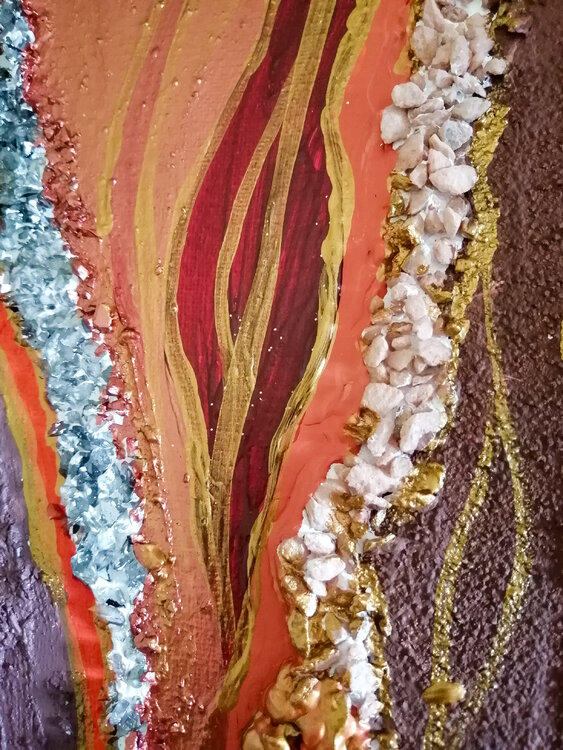 Este cuadro abstracto inspirado en la gemología se da un aire a las piedras llamadas Ojo de Tigre con sus diferentes reflejos y matices rojizos y oro.