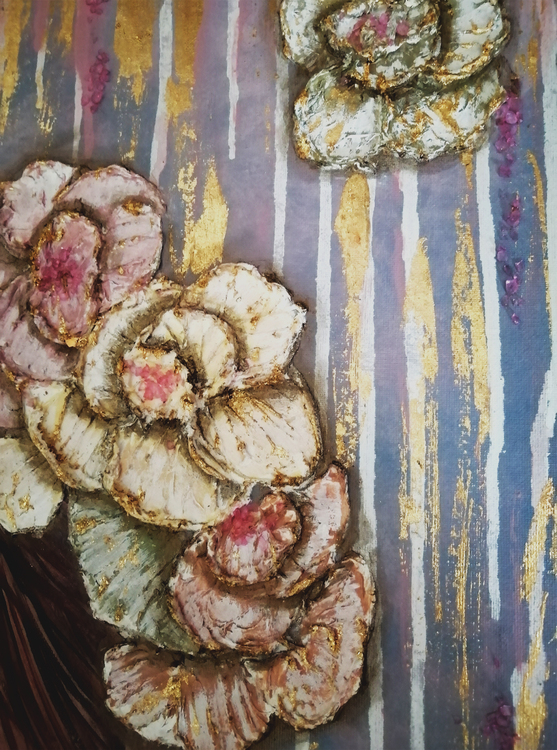 Obra de técnica mixta: Pintura acrílica y metálica, Fiber paste, tinta de alcohol, pan de oro y glass nuiggets.