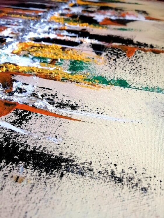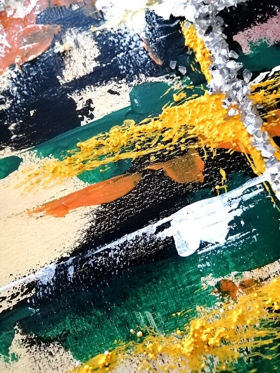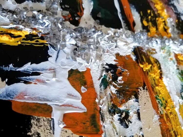 pintura abstracta.Técnica mixta, tinta al agua, betún de judea, acrílico, óleo, arena cristalizada, piedra decorativa, pintura metalizada, hoja de cobre, vidrios rotos para decoracion