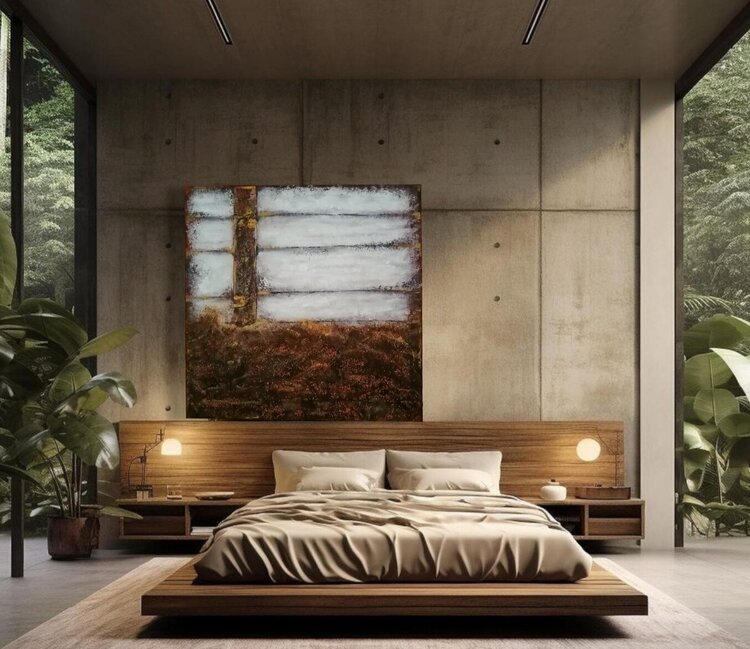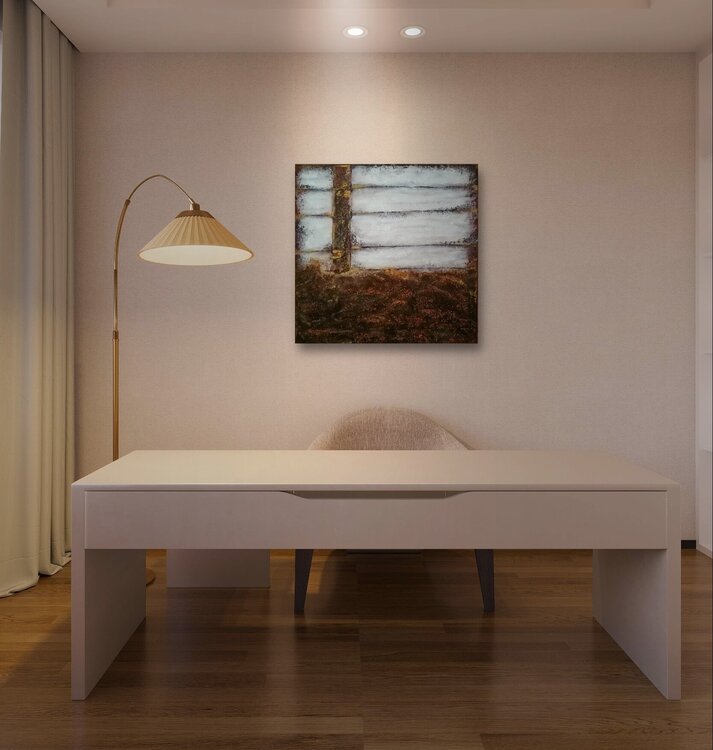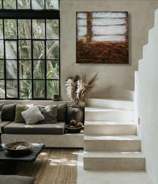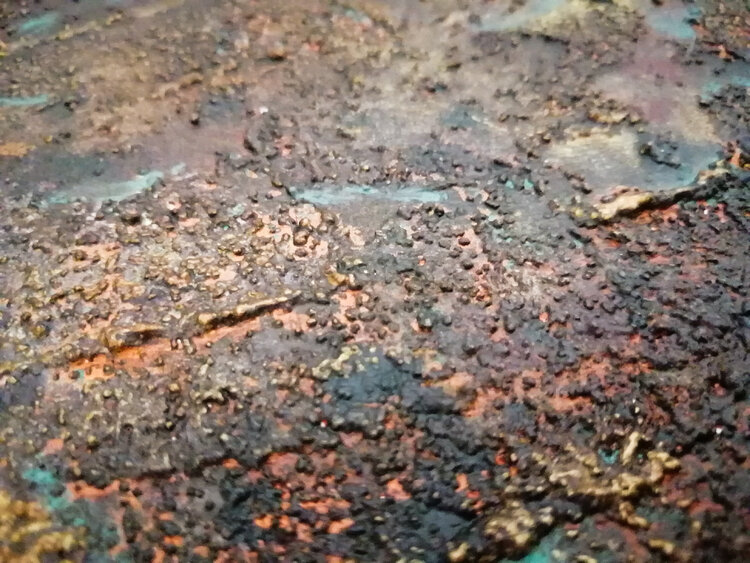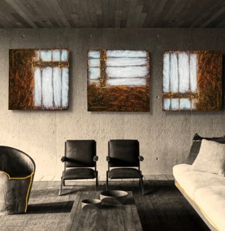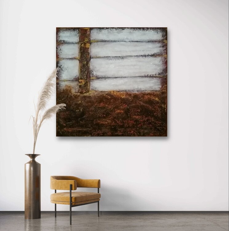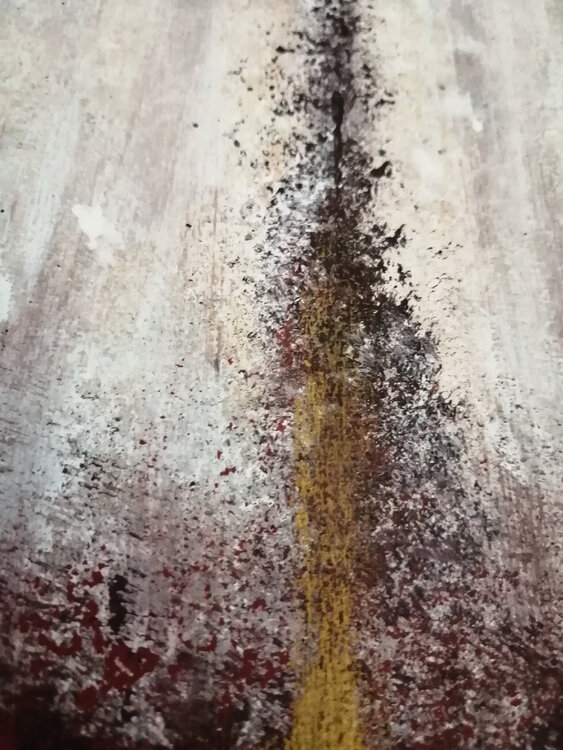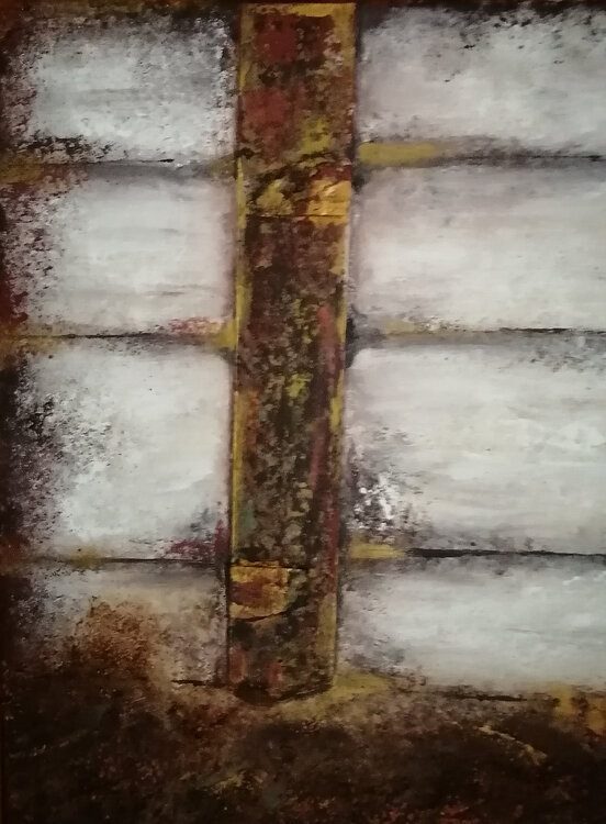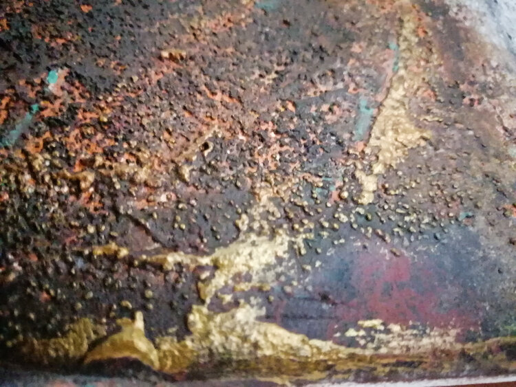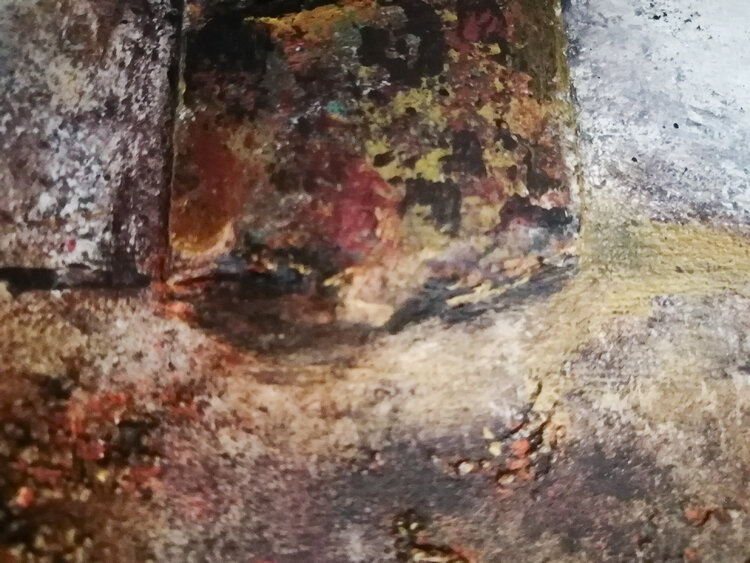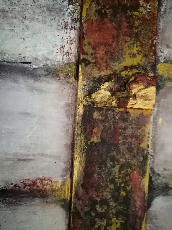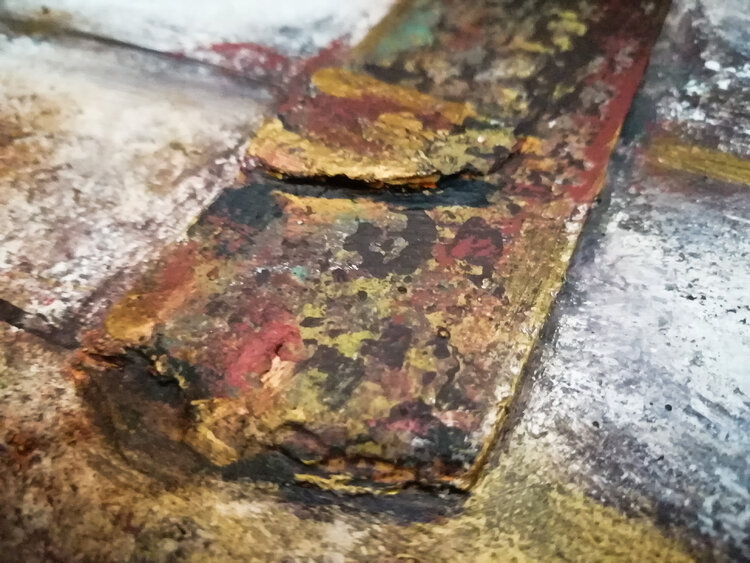La artista vuelve al mixed media , tras un tanto tiempo sin hacer falso óxido y falsa madera, pero lo que se lleva dentro pues dentro permanece y sale cada vez que se le da rienda suelta a lo que siente, sin pensar, solo dejarse llevar. Esta vez sin música, le apetecía trabajar en silencio consigo misma