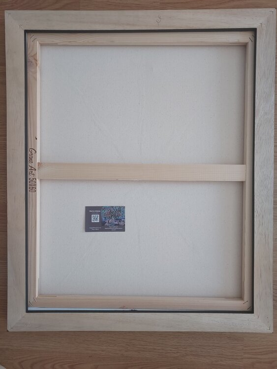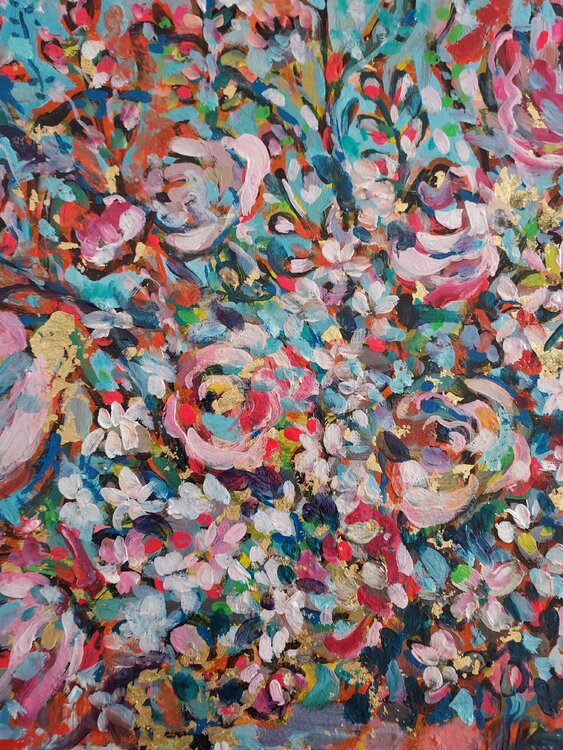 Este trabajo se realizó en pintura mediante incrustaciones de pan de oro de forma aleatoria. Los pigmentos de los colores al óleo fueron elegidos por colores cálidos en proximidad directa a colores más alejados en el calendario cromático para mantener el brillo de la mañana.