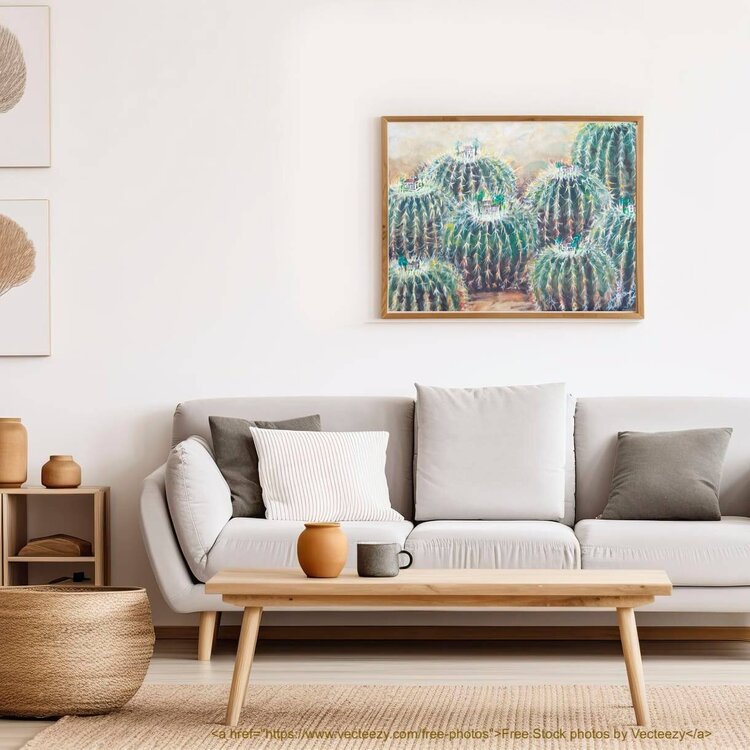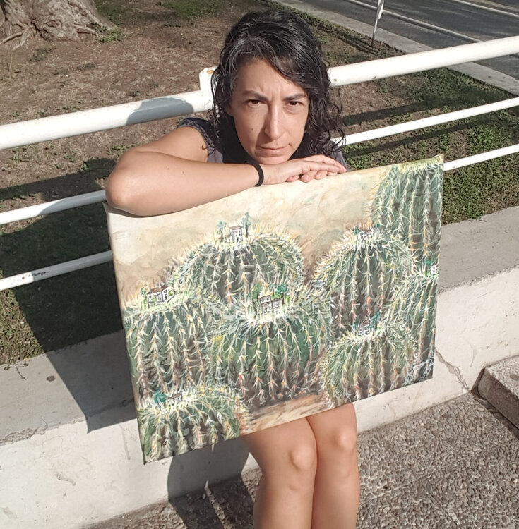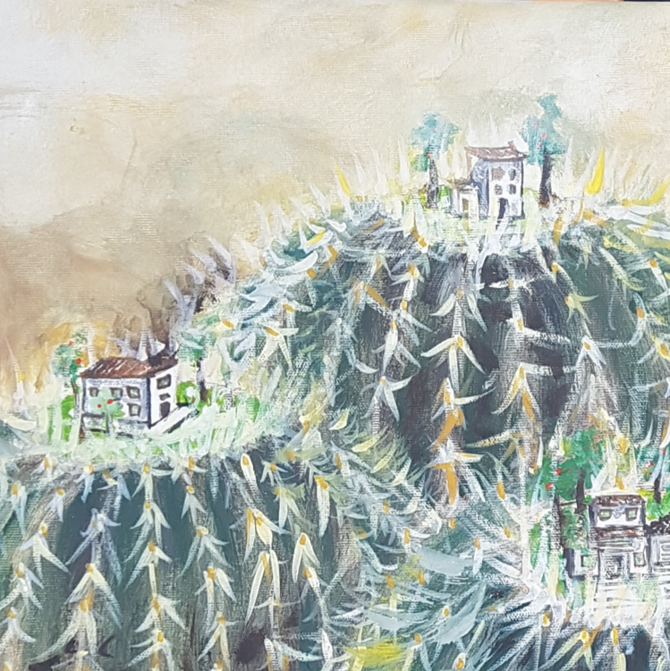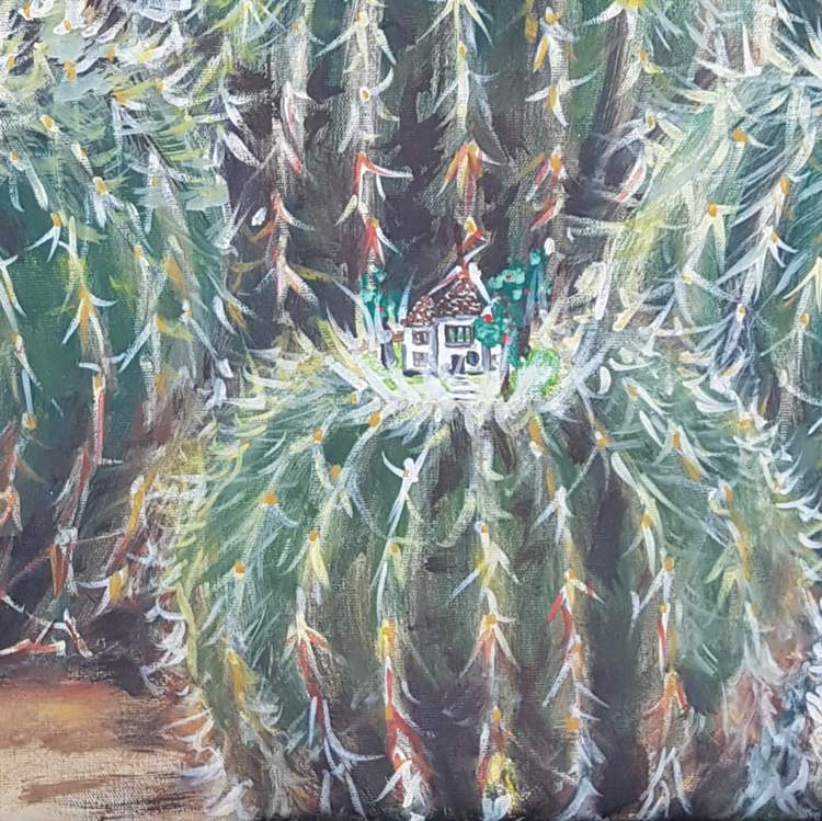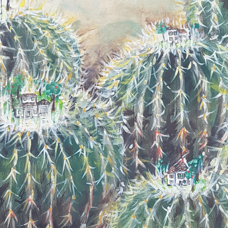 Esta pieza es parte de la serie “Cactus” se asocian las plantas con nuestras actitudes en la sociedad. En este caso cómo se podrían haber construido nuestras ciudades a partir de la idea de una protección pasivo/agresiva hacia otros que nos parecen diferentes o desconocidos. La visión del cada persona depende del punto de vista de cada una en la pintura. Estar sobre el cactus protegido, estar dentro del cactus encerrado, estar fuera del cactus rechazado,1