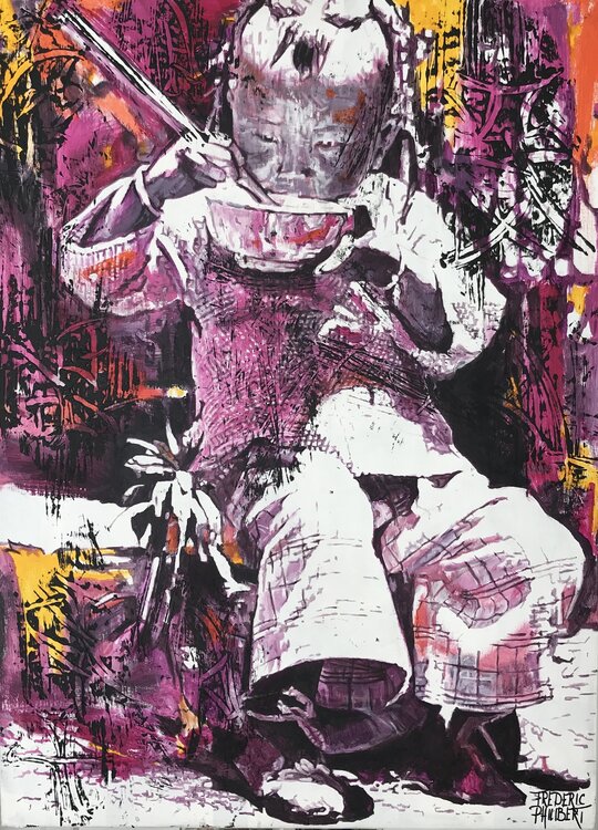 En este cuadro una niña china vestida con ropa tradicional es el centro de atención. Sentada, sostiene delicadamente los palillos, lista para disfrutar de su comida. Los reflejos de luz resaltan los delicados rasgos de su rostro. El rosa domina la paleta de colores. todo en esta pintura rezuma tranquilidad y armonía, evocando la belleza eterna de la tradición y la infancia.