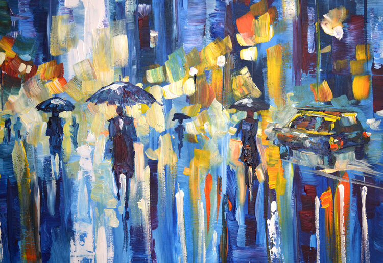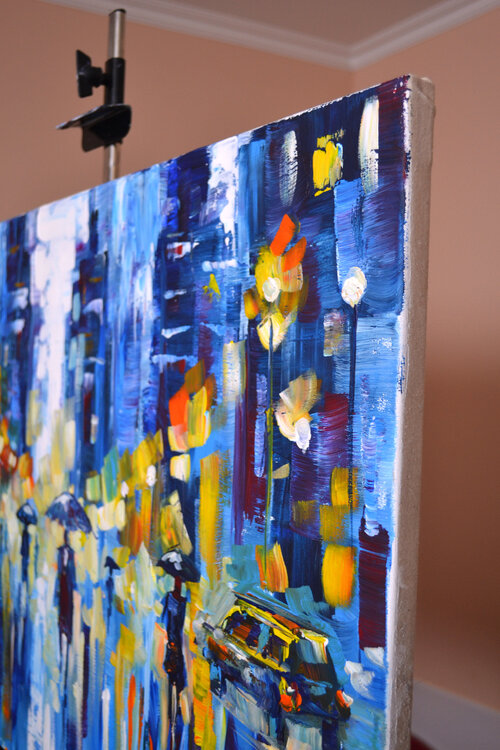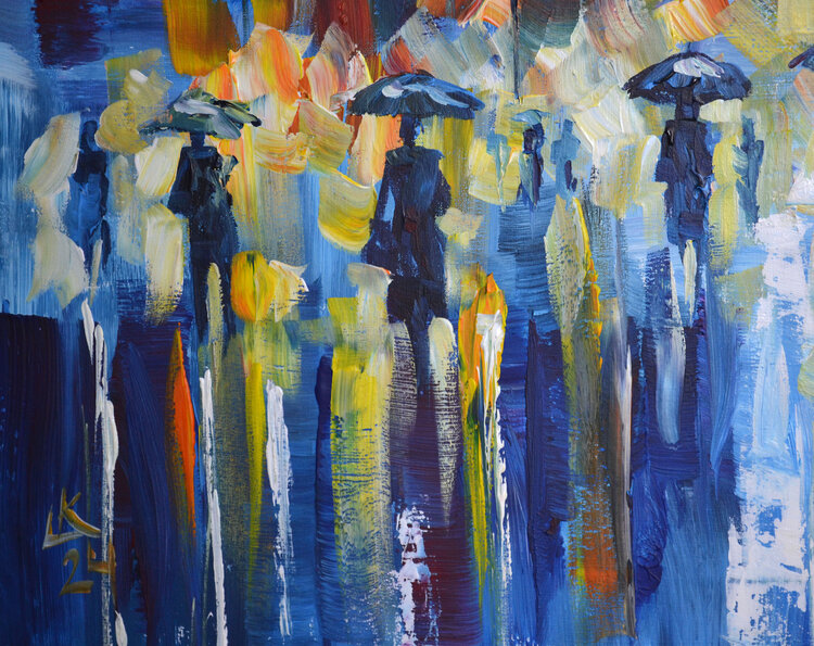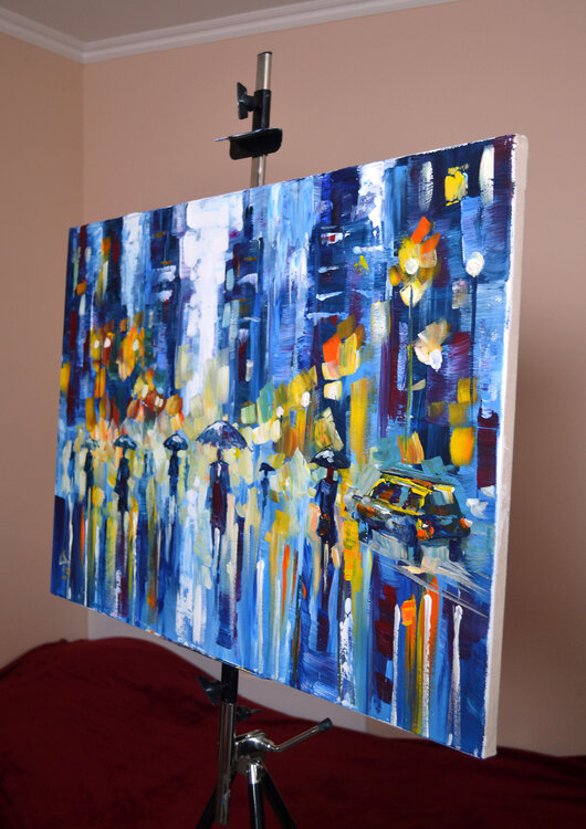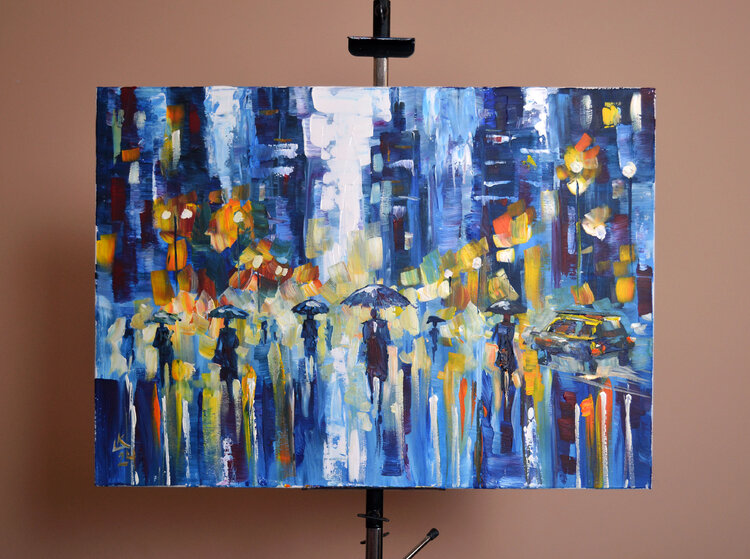 Esta hermosa pintura captura la esencia de una noche lluviosa en la ciudad. La artista, Lada Kholosho, ha combinado hábilmente los estilos expresionismo, minimalismo, abstracto, impresionismo y modernismo para darle vida a este paisaje urbano. Esta pintura de tamaño mediano, que mide 20 pulgadas de alto y 27 pulgadas de ancho, está creada sobre lienzo utilizando técnicas de pintura acrílica. El cuadro está firmado por el artista. Presenta un tema1