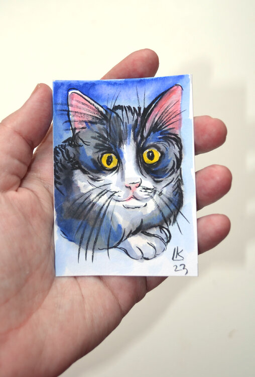 Esta es una pintura diminuta de acuarela (6x9 cm) que puedes enmarcar y colgar por separado o en compañía de otras miniaturas. Esta miniatura es parte de la serie de miniaturas coleccionables "Paleta felina" para ver más pinturas de esta y otras colecciones, visite mi escaparate.