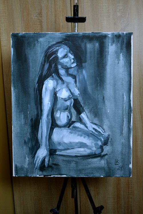Esta hermosa pintura única presenta a una mujer desnuda sentada de rodillas. La pieza fue creada por el talentoso artista Lada Kholosho en Estonia utilizando pintura acrílica sobre lienzo. Esta obra de arte de tamaño mediano, que mide 24 pulgadas de alto y 20 pulgadas de ancho, muestra un impresionante estilo tonalista con elementos de arte contemporáneo, retratos, expresionismo, arte figurativo, realismo, impresionismo, postimpresionismo y modernismo.1