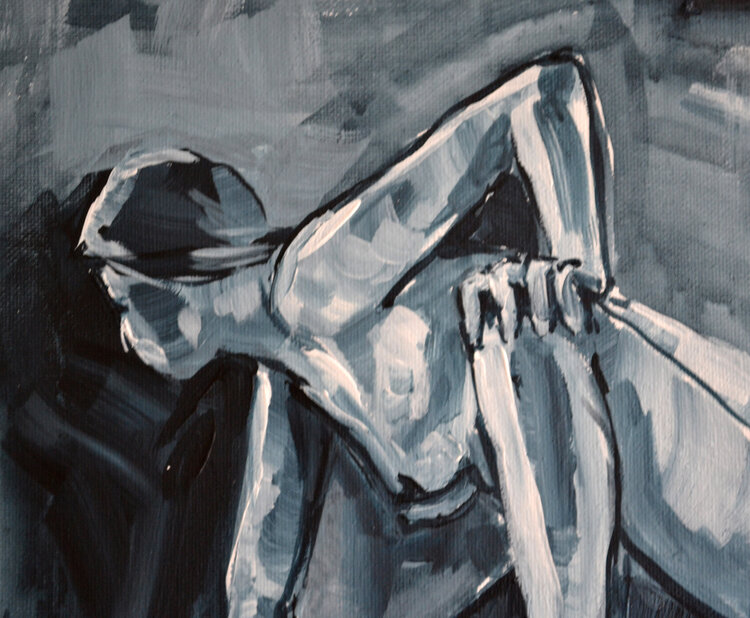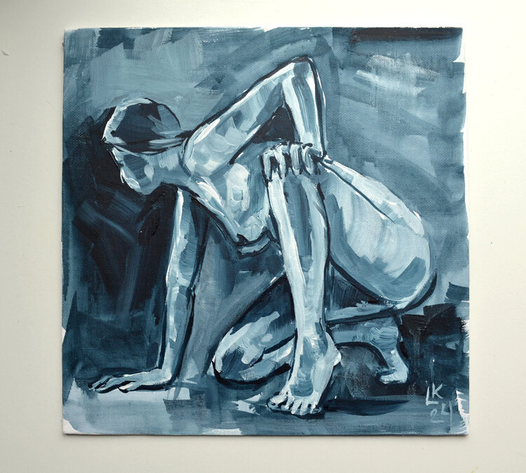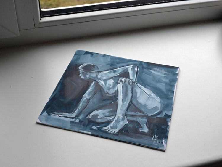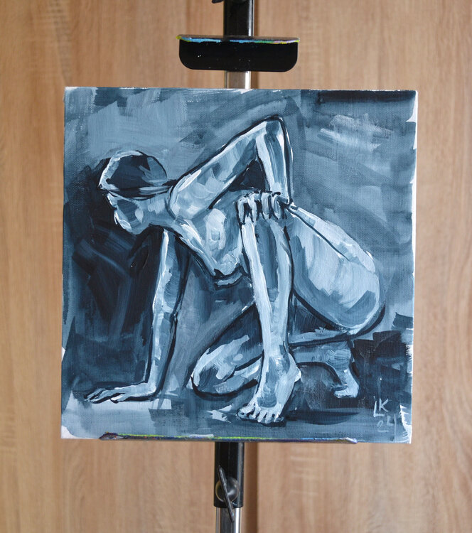 Esta obra de arte única presenta un desnudo femenino en tonos grises, pintado por la artista Lada Kholosho en 2024 utilizando acrílico sobre lienzo. El cuadro de 25x25 cm está sin marco y hecho a mano. Es un objeto coleccionable único, firmado por el artista y perfecto para cualquier coleccionista o entusiasta del arte. La pintura captura la belleza y la gracia de la forma femenina, centrándose en representar al sujeto en una paleta monocromática.1