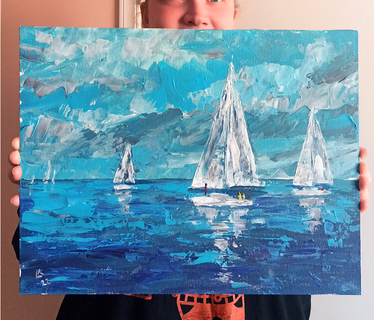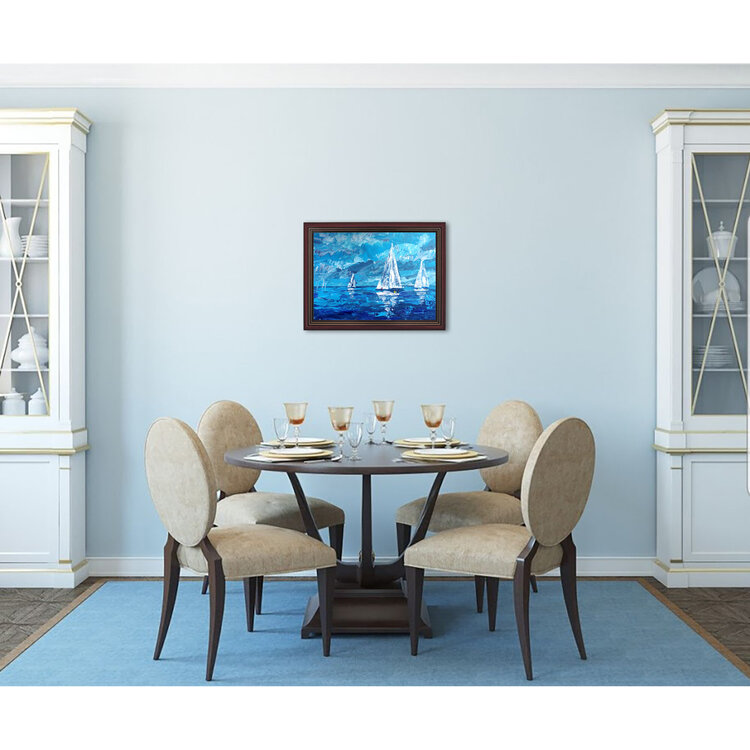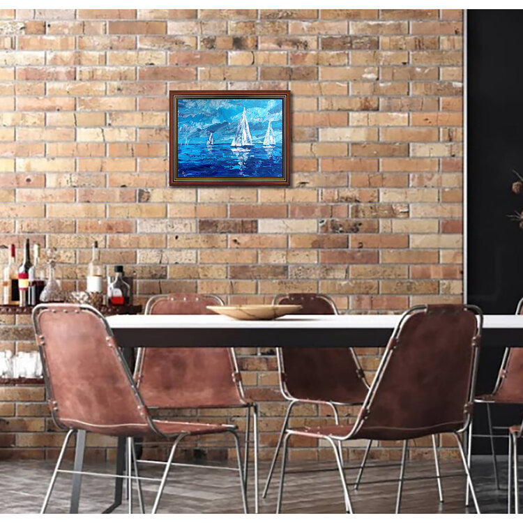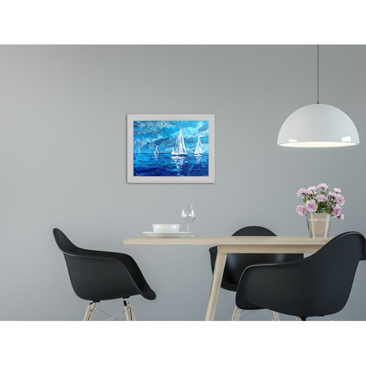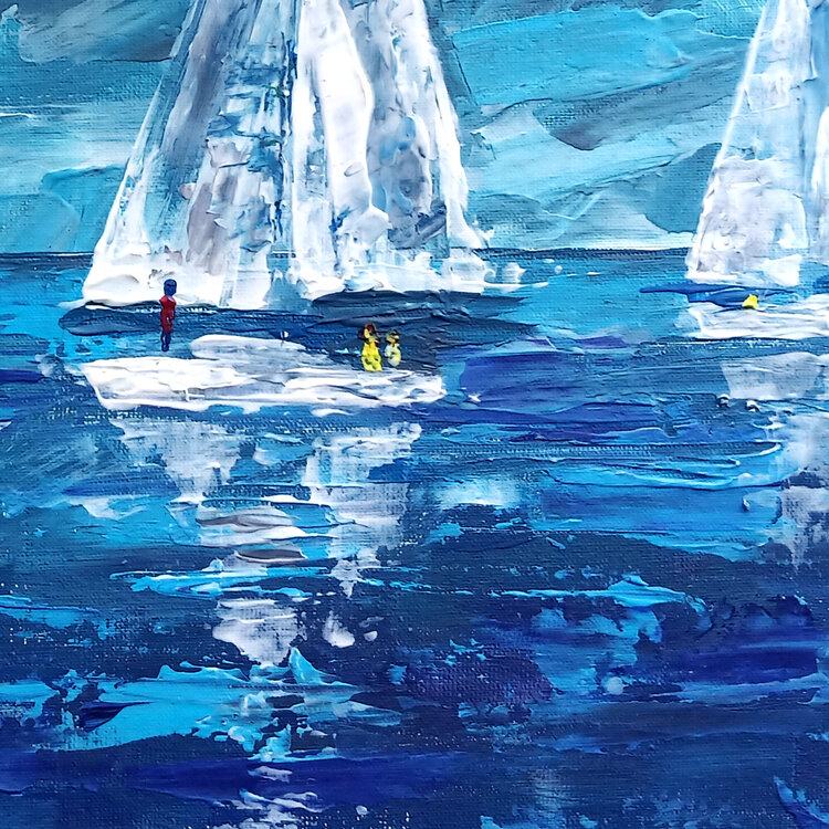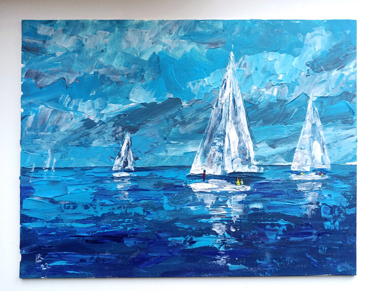 Paisaje marino con veleros, regata de vela, mar, paisaje acuático oceánico, pintura original única.