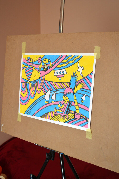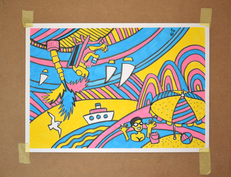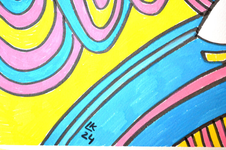 Esta pintura original moderna presenta una composición vibrante y caprichosa creada con marcadores sobre papel. Muestra un paisaje abstracto y divertido lleno de líneas y curvas dinámicas y atrevidas. La escena está marcada por elementos caprichosos como personajes y estructuras abstractas, incluidos paraguas, barcos y figuras peculiares que añaden un elemento narrativo. La paleta está dominada por colores primarios brillantes: amarillo, azul y rosa,1