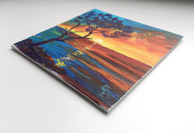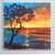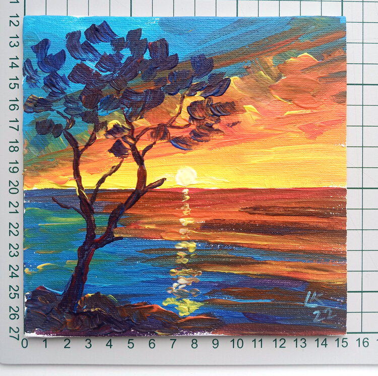 Paisaje marino, cielo al atardecer, árbol, mar, paisaje acuático oceánico, pintura original única.