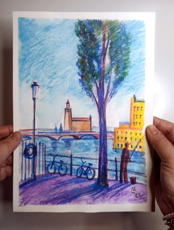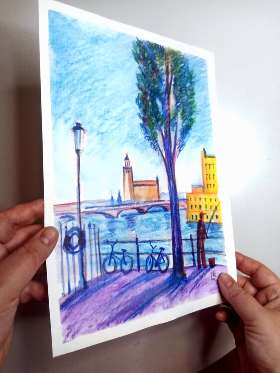"La vista de Estocolmo" - original, obra de arte única. Pintado a mano con lápices de acuarela sobre papel. El tamaño de la obra de arte es de 30x21cm. Esta foto fue inspirada por viajar a Suecia. Sin enmarcar. Firmado por el artista.