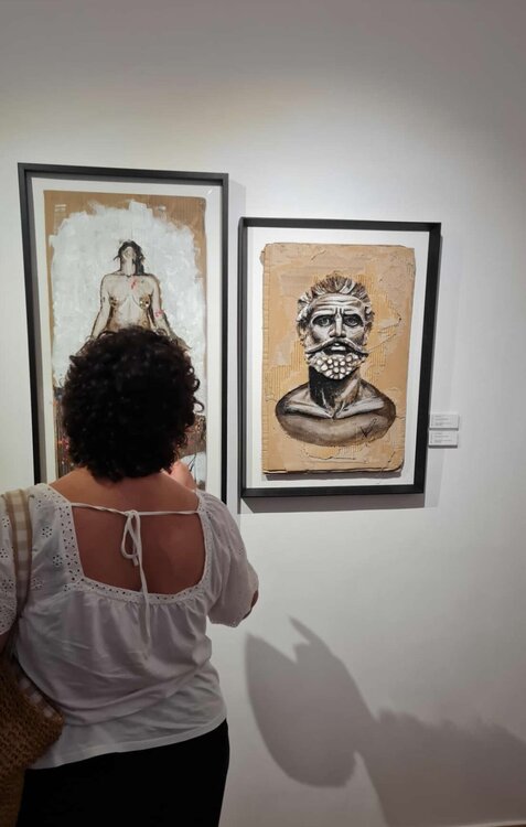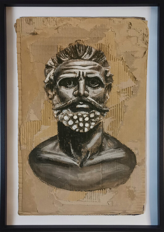 Busto de hombre griego sereno, robusto, adulto, realizado sobre cartón desbastado, pirograbado ,cuchilla, fuego y acrílico.