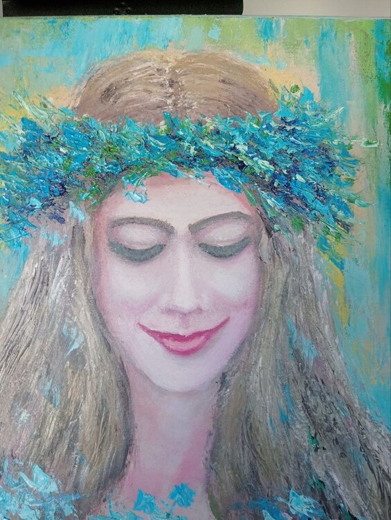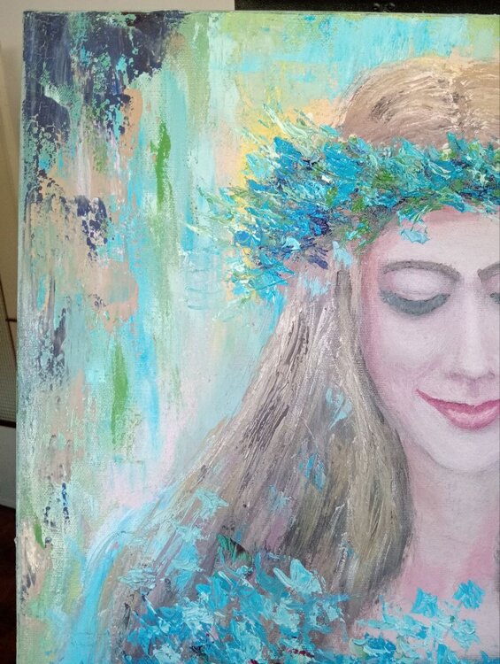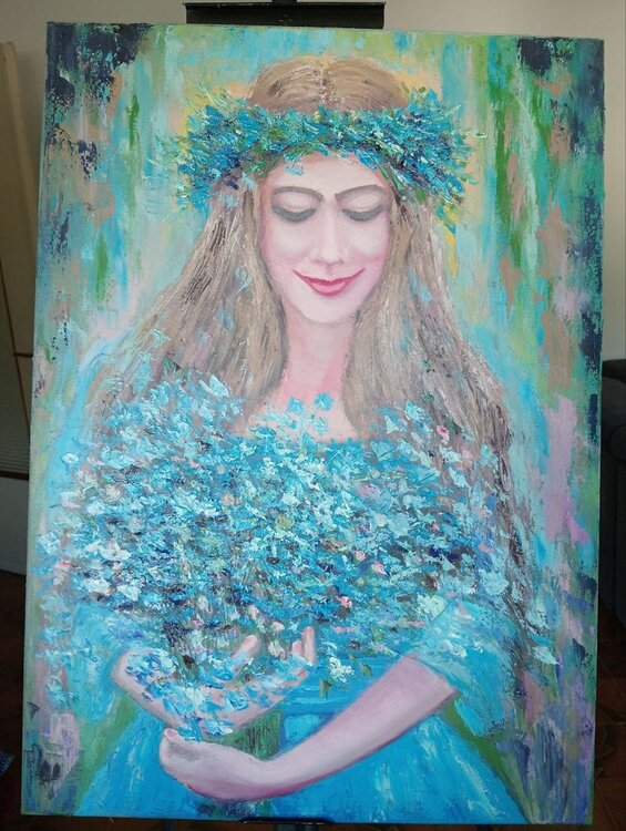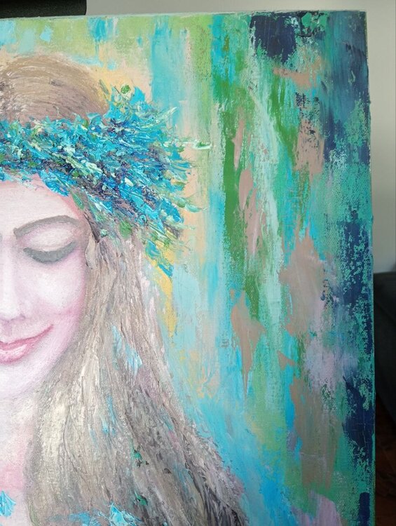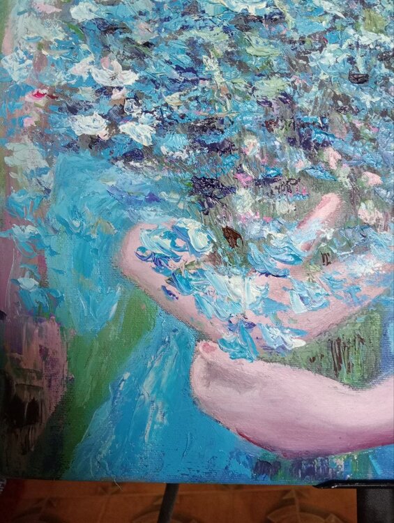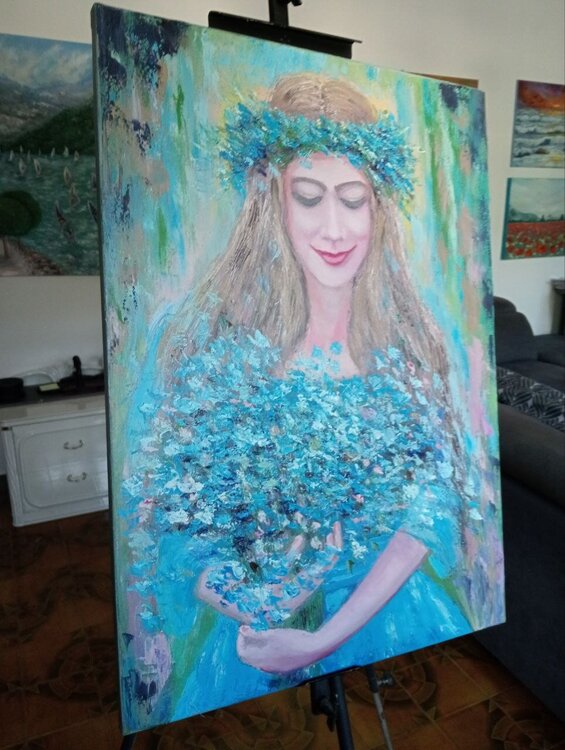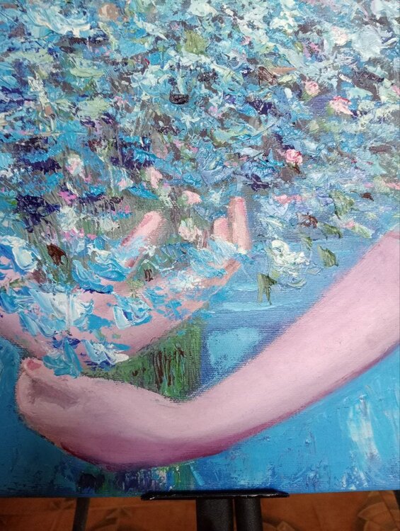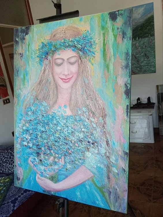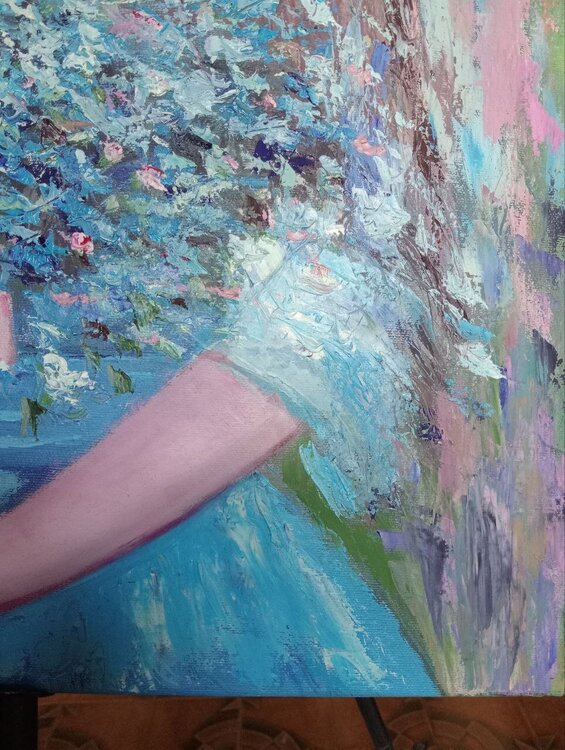 "Celeste" es un cuadro que encanta por su gracia y delicadeza. Pintada sobre lienzo con maestría y estilo impresionista, la obra presenta en el centro de la composición a una joven envuelta en un vestido azul claro, que se funde armoniosamente con la luz y los colores circundantes.