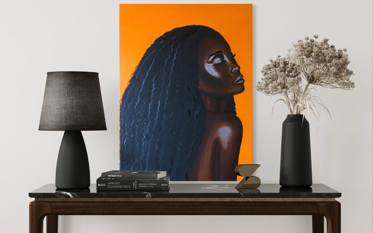 Esta pintura muestra a una mujer negra soñando sobre un fondo naranja brillante que resalta su hermoso color marrón. Y también tiene algunos brillos en la cara como punto culminante.