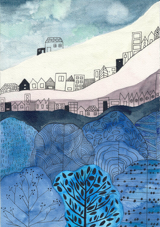 Arbol y bosque, bosque original en acuarela, ciudad y bosque, arboles en acuarela, casas, ilustración urbana
