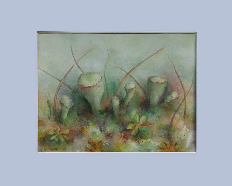 En esta suave pintura de acuarela, los tonos verdes naturales evocan una atmósfera tranquila. Dominando la escena están los hermosos musgos, que se elevan hacia el cielo. La pintura invita al espectador a explorar sus detalles y encontrar la serenidad dentro de este suave paisaje.