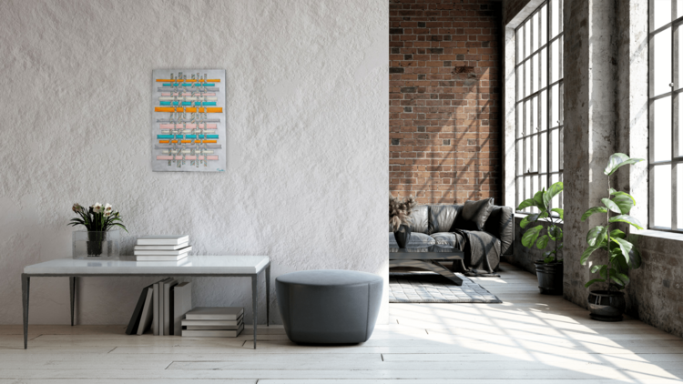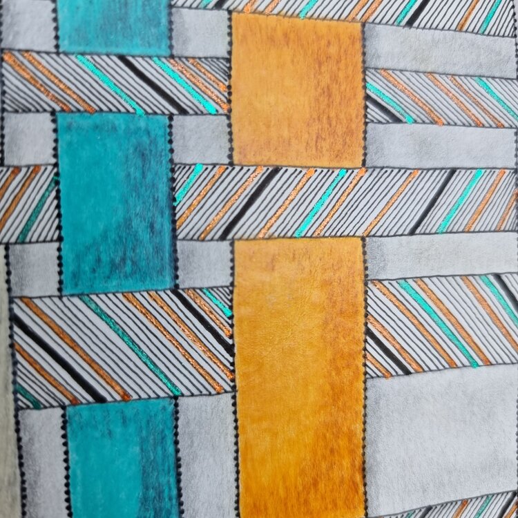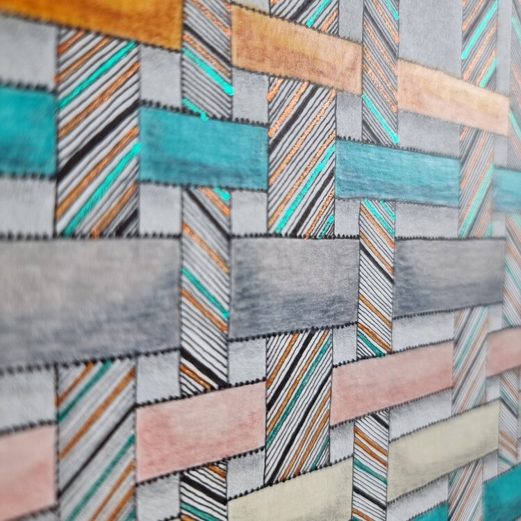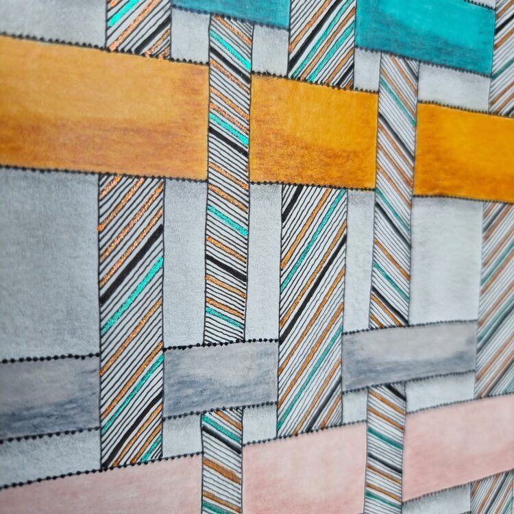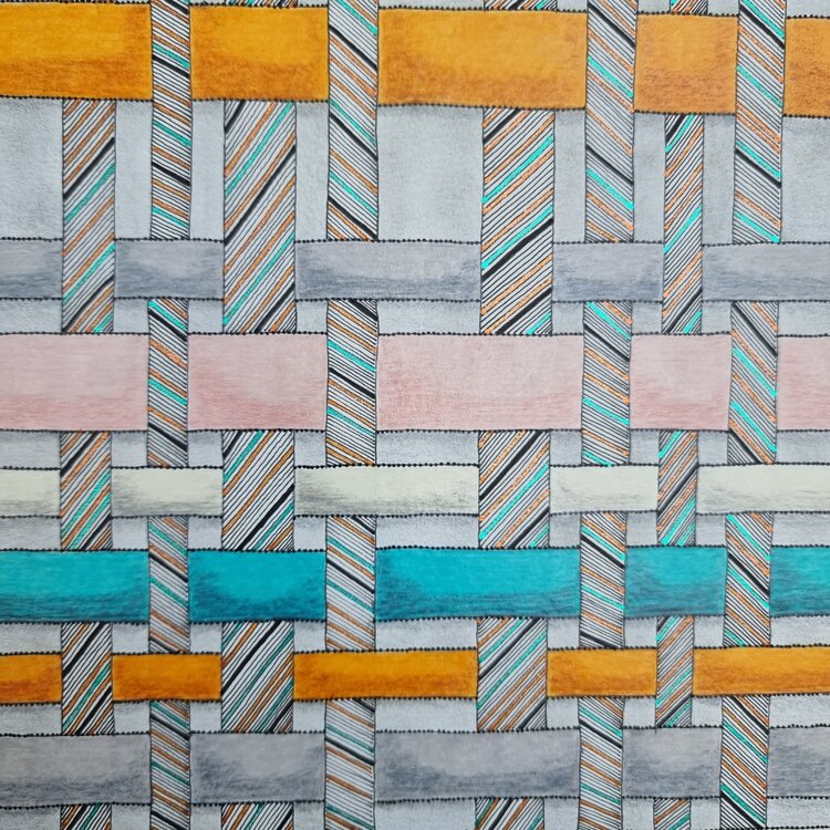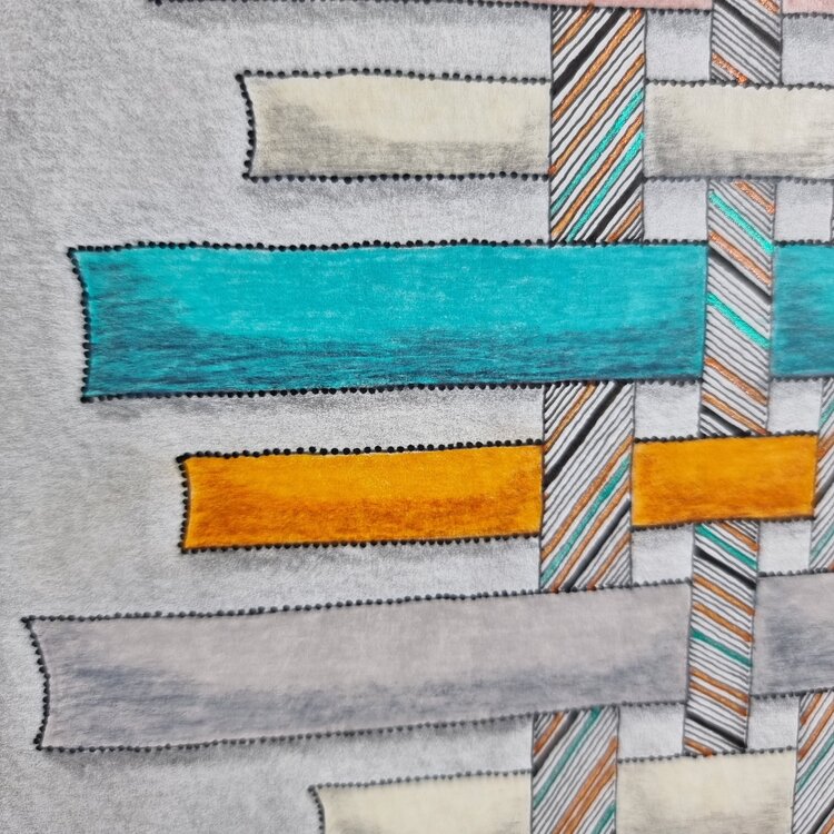 donde se cruzan los hilos de urdimbre y los hilos de trama superpuestos. Los colores dominantes son el amarillo cobrizo y el azul, con colores más claros: rosa, gris blanquecino, todos sobre fondos gris claro, sobre papel de 300 g. El tejido siempre es inspirador, está presente en diferentes mitologías y es origen de muchos cuentos.