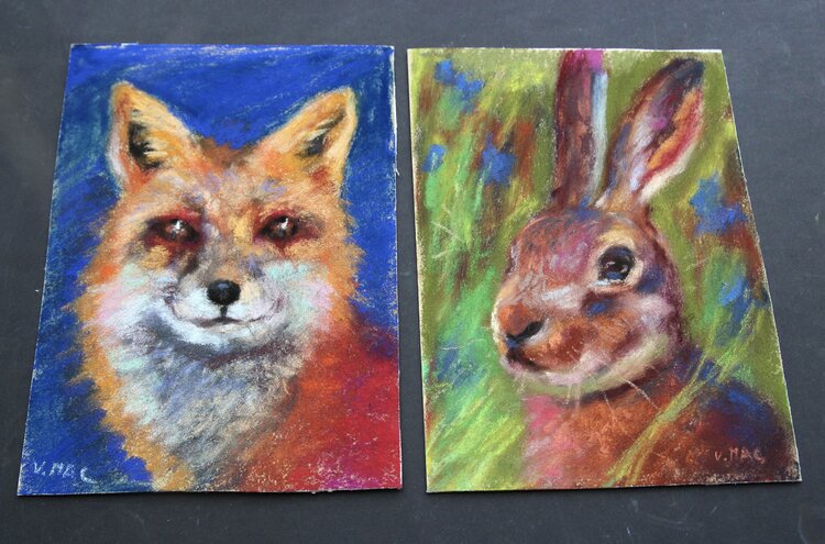 Pintura colorida de un conejo sobre una tarjeta pastel Sennelier de archivo creada y firmada por Viktorija Maciuleviciute. ¡Una obra de arte de conejito única para disfrutar durante muchos años! La pintura está ejecutada en pastel suave, el medio más permanente que realza los colores y la hermosa textura aterciopelada. ¡Esta pintura de animales felices es un verdadero levantador de humor!
