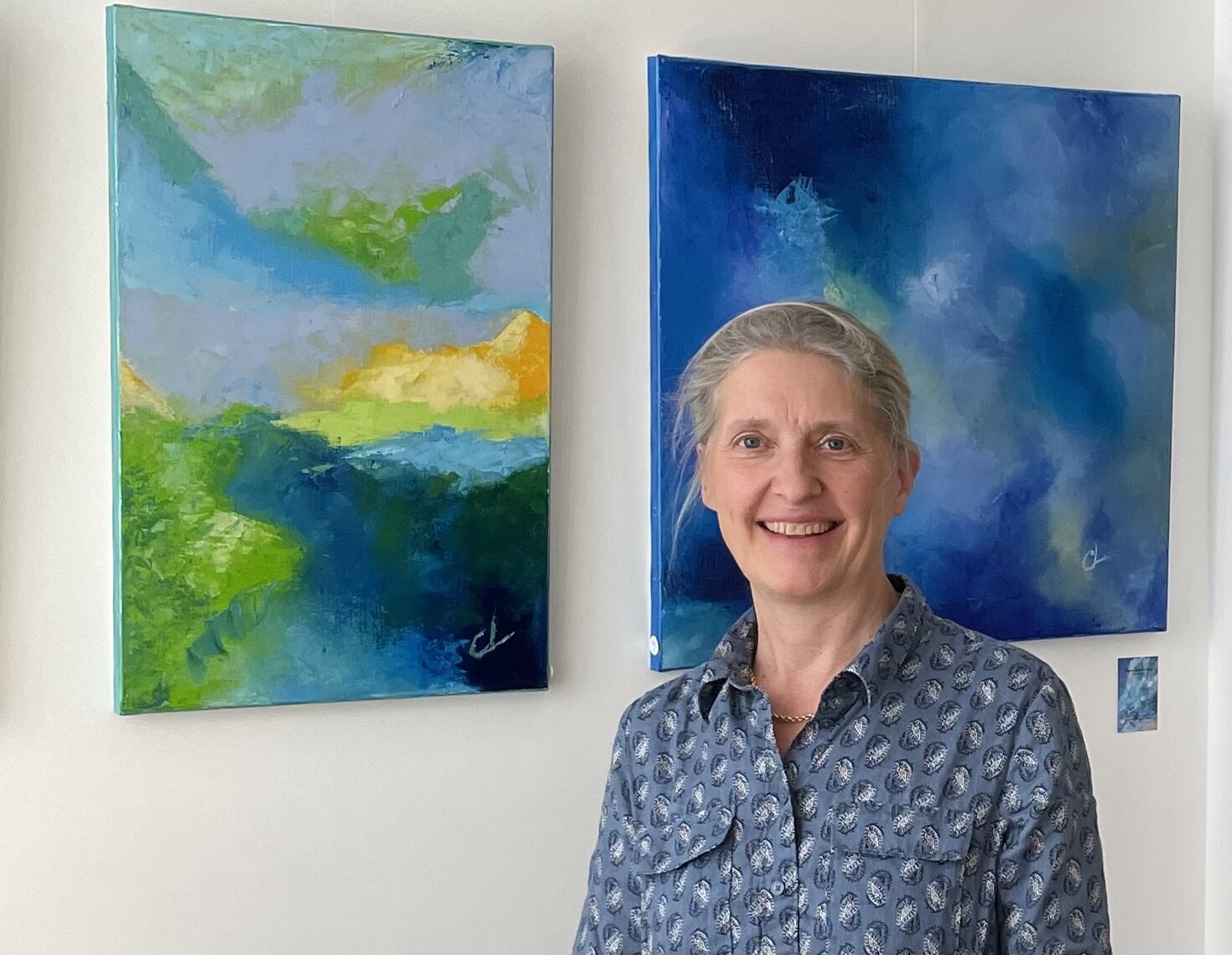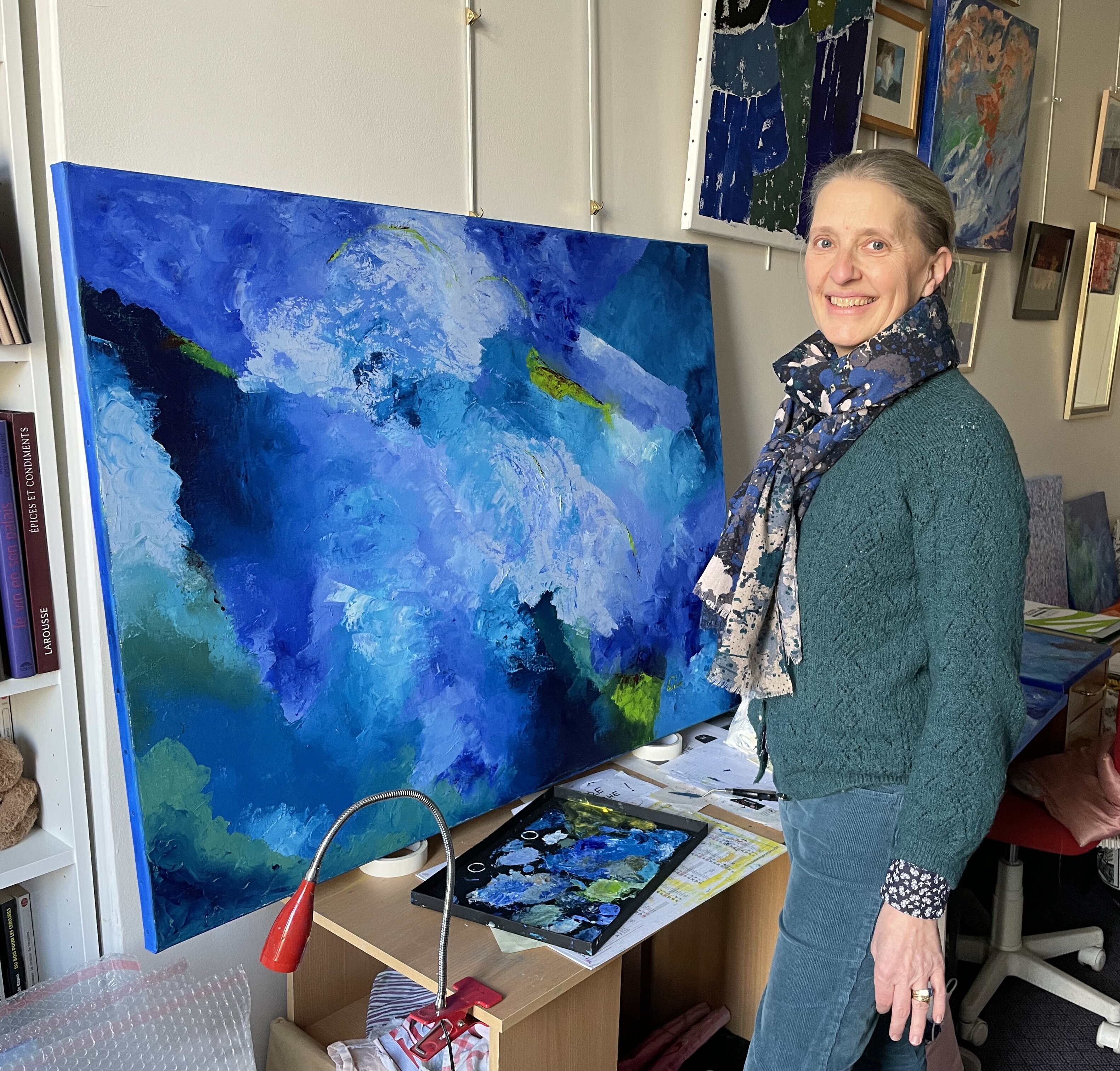 Après une formation d' histoire de l'art à l'Icart puis des activités de médiation culturelles, je me suis dirigée vers la restauration de peinture. Cela m'a apporté une connaissance de la couleur, des nuances, des supports, des vernis .. Une envie de créer par moi même, de laisser l'outil aller où il voulait, m'est venue, et d'être libre par rapport à l'oeuvre. Principalement abstraite, ma peinture laisse toujours le regard maitre d'y choisir ce quelle évoque, ou ce qu'il apporte. Elle stimule l'imagination, au gré des vents, comme les autres éléments, terre, mer, air qui l'inspirent. Je me sers principalement du couteau, pour la diversité de sa touche. Des bleus profonds, souvent dominants, résonnent comme un appel lointain mais présent, à la sérénité. (Droits gérés par ADAGP Paris.)