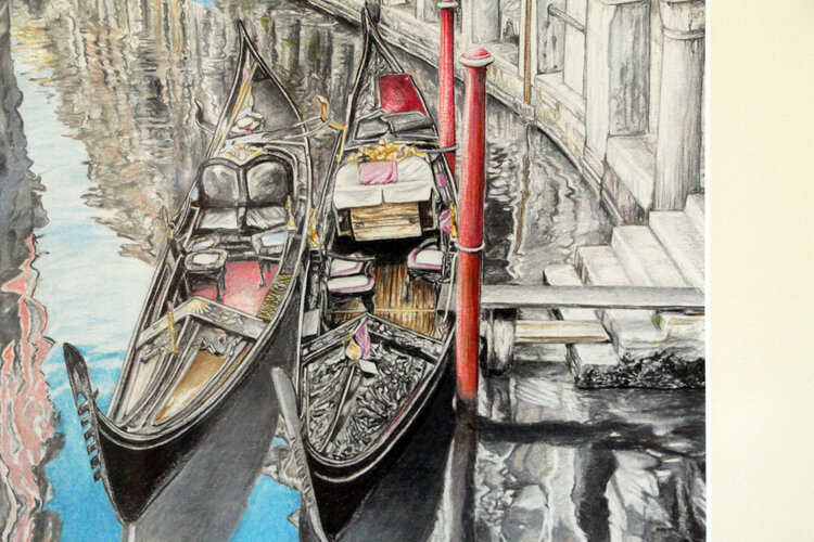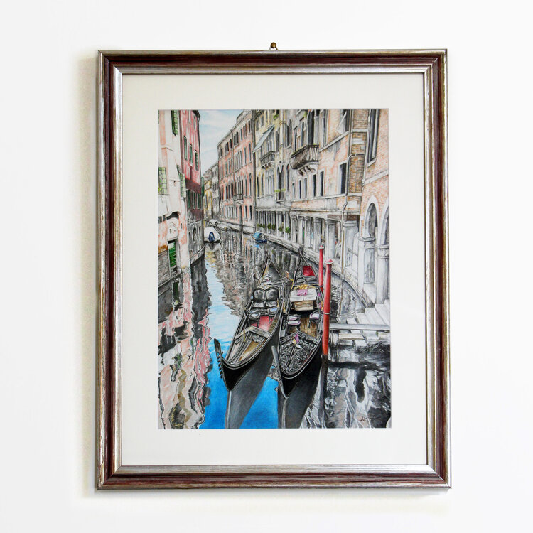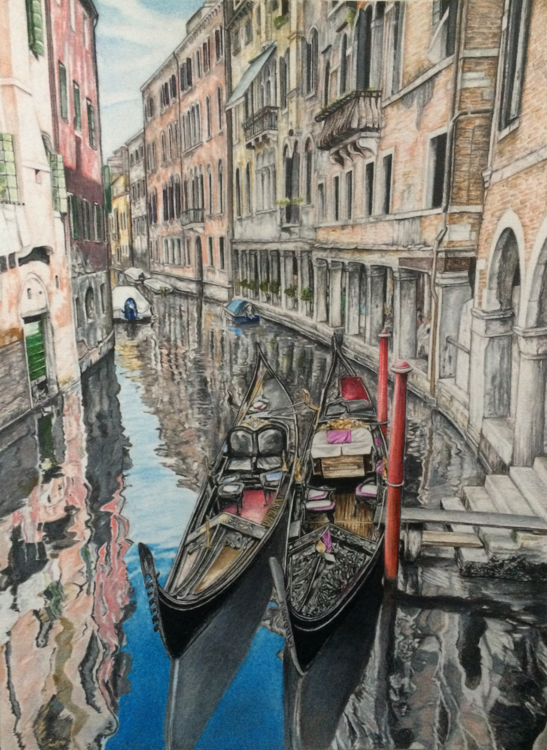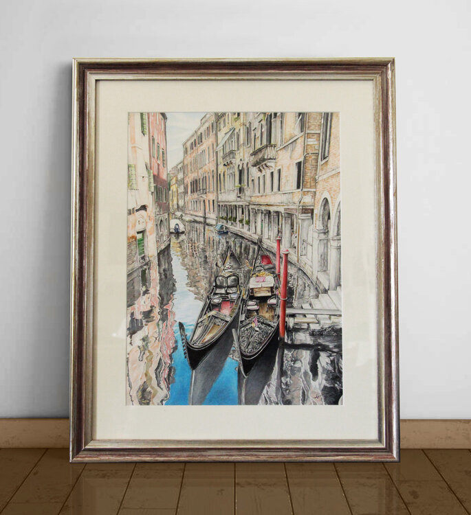 « Gondole a Venezia » met en scène les emblématiques gondoles vénitiennes dans un petit canal. Le manque de monde tente de donner un sentiment de tranquillité et de détente, comme celui que l'on éprouverait dans un canal isolé, essayant de redonner à la cité lagunaire un calme que le flux touristique ne permet souvent pas d'apprécier.