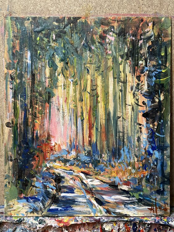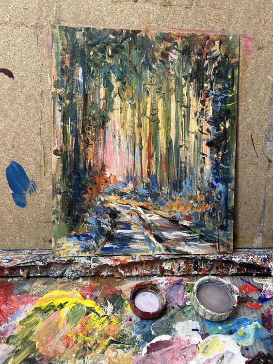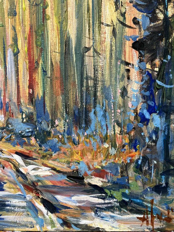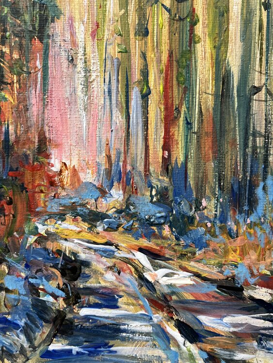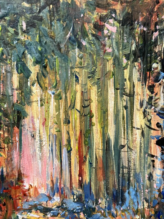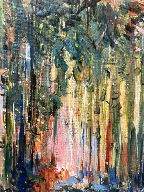 Vue impressionniste des buissons et des arbres près du lac de Garde. J'étais trop impressionné par la lumière du soleil et le contraste marqué des couleurs offertes par l'emplacement. Couleurs acryliques professionnelles sur toile. Les deux côtés ont signé.
