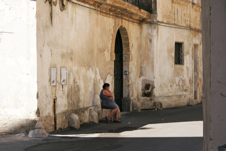 Cette photo montre une ruelle solitaire à Lecce, dans les Pouilles, au milieu de l'été. On voit une femme assise sur une chaise à l'ombre devant sa maison.