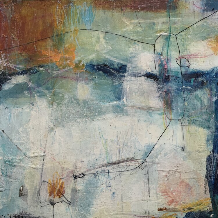 Oeuvre mixed media sur panneau bois, finition cire froide, encadrée caisse américaine bois blanc, dimension encadrée 35 x 35 x 3 cm, système d'accrochage au dos.