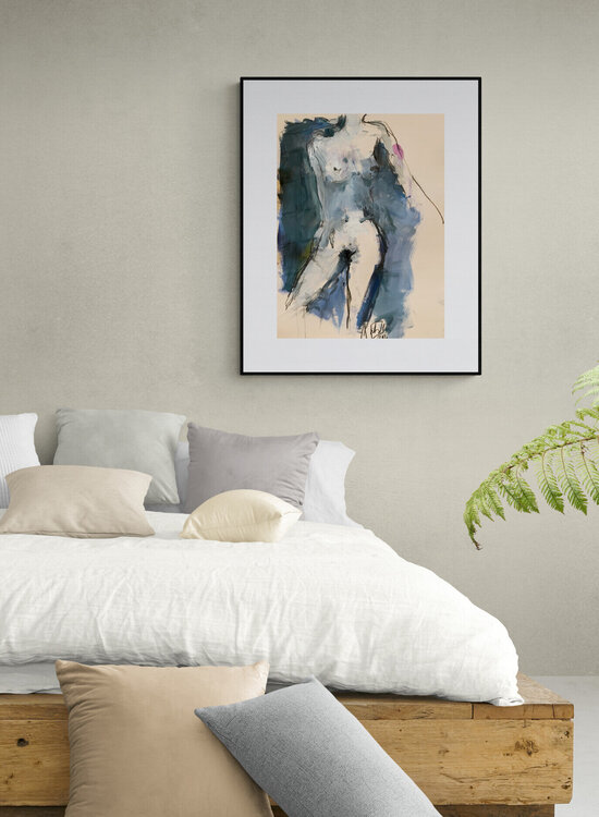 Un nu peint à l'acrylique et fusain à partir d'esquisses croquées en séance de dessin modèle vivant, sur un beau papier épais de chez Fabriano.