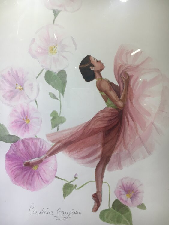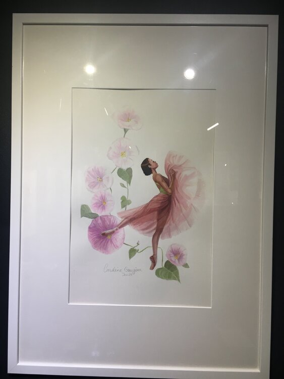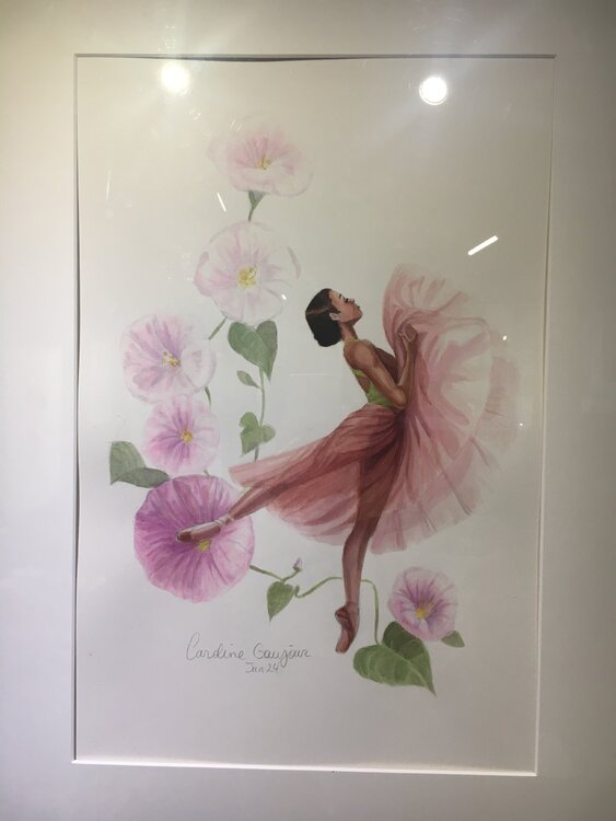 Cette oeuvre marie la légèreté et la transparence des liserons à celle de la jupe de la danseuse. C'est une aquarelle sur papier d'Arches, 300 mg/m2.