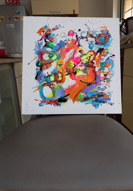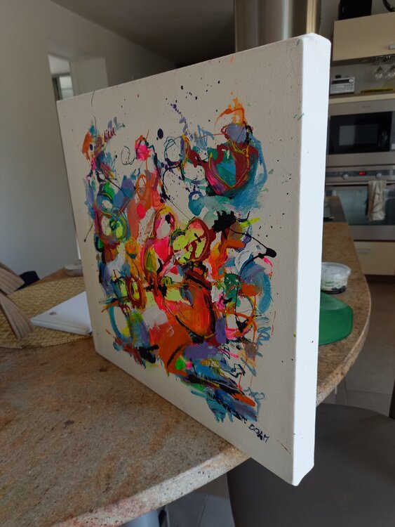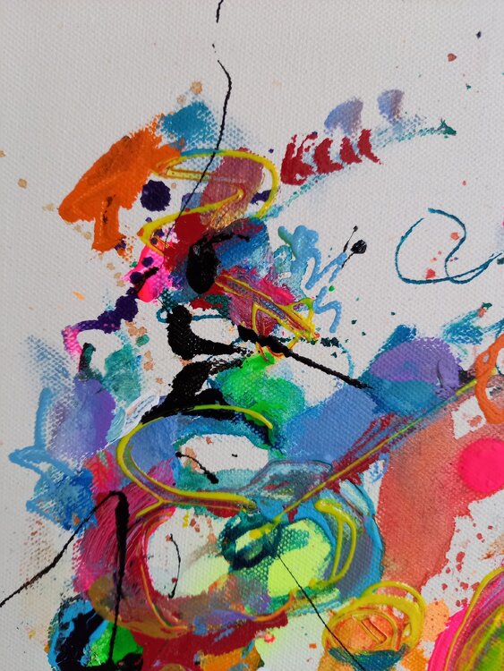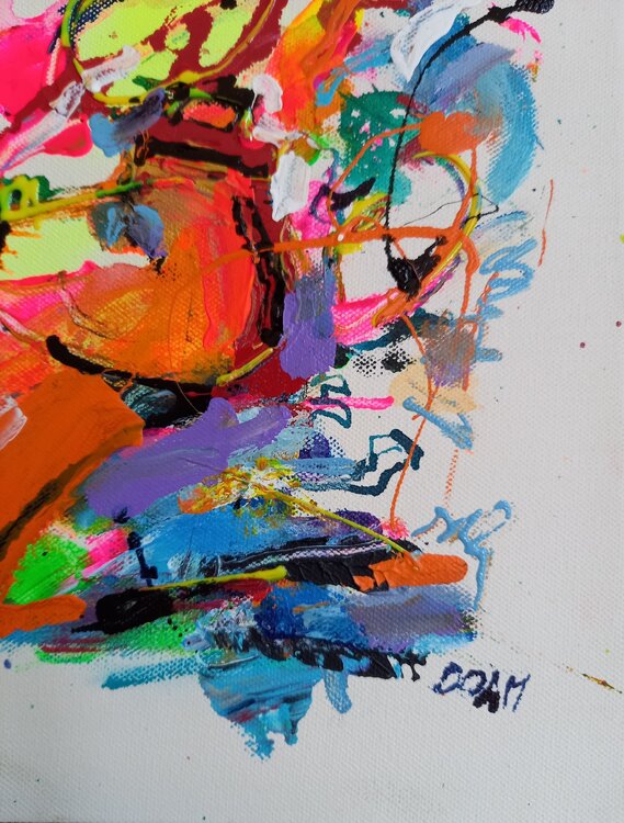DOAM a peint cette oeuvre sur le thème de la musique, thème qu'elle travaille depuis plus de 10 ans. Elle a eu l'occasion d'exposer l'an passé à Cognac pour le festival de jazz. Un orchestre de rue a joué sur leurs instruments à vent et percussions, arpentant les rues et apportant rythme et gaieté à tous ceux qui voulaient les entendre. Cela a inspiré à l'artiste une série de toiles dont les couleurs chaudes ici en orangé, vert, jaune et bleues ressortent1