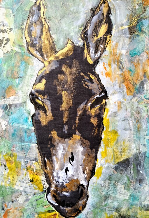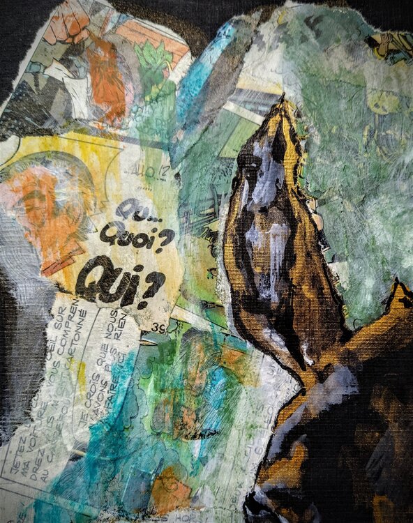 Tête d'âne sur un arrière-plan composite, consistant en un assemblage d'extraits de bandes dessinées. Il s'agit parfois de regarder en face l'absurdité du monde.