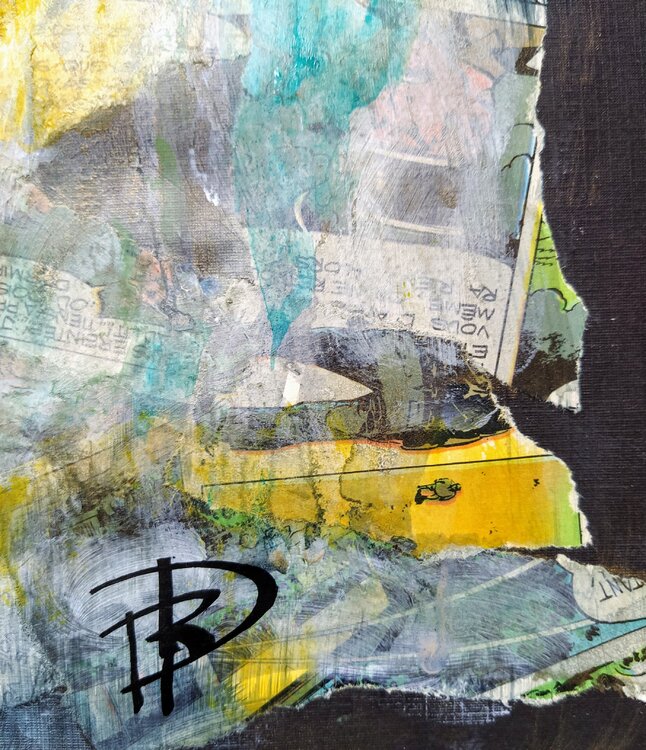 Découper et assembler, juxtaposer, insérer, lisser et marquer, tel est le processus qu'elle aime à suivre pour ses compositions abstraites. Elle progresse, l’esprit confusément imprégné d'œuvres observées et aimées, mais aussi guidée par l’air du temps présent.