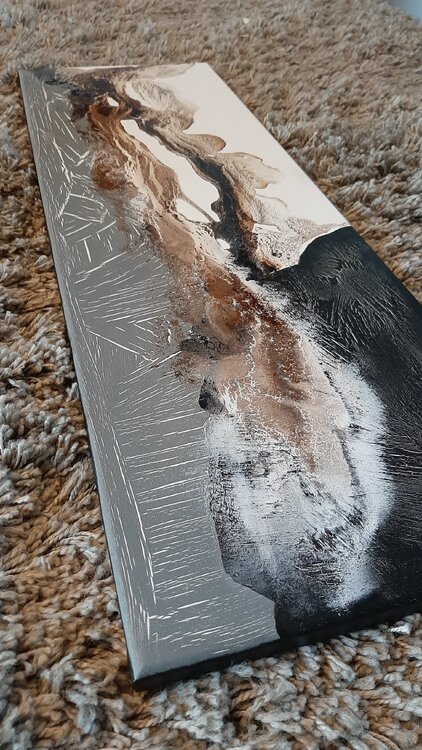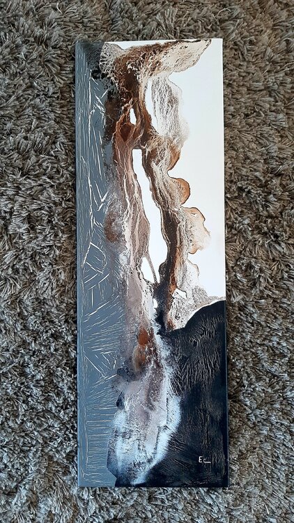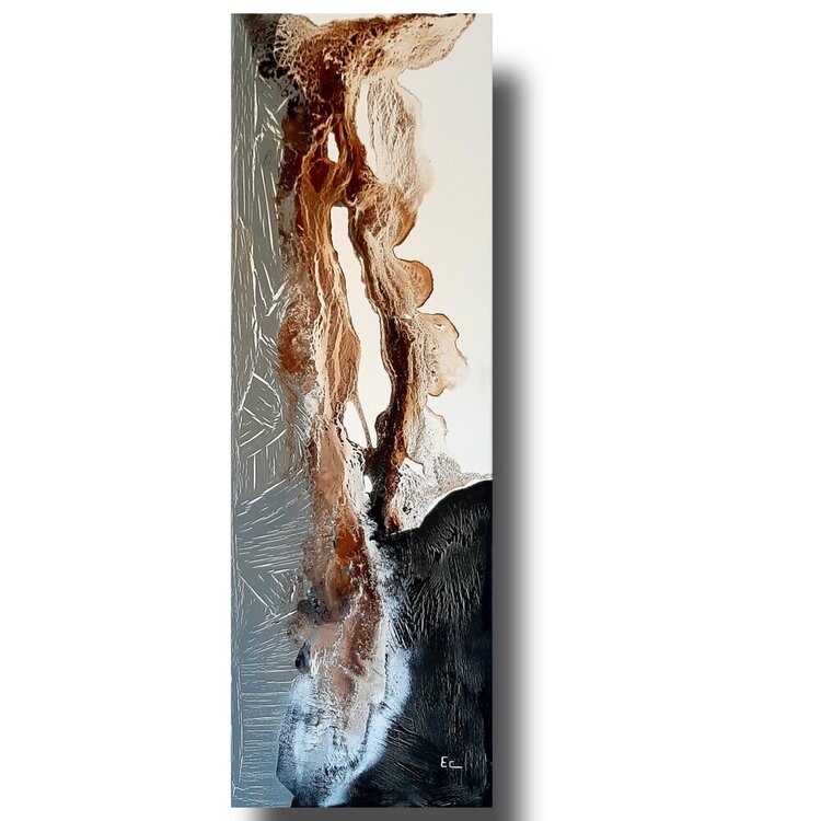 "Au fil de l'eau" est une œuvre qui mêle caractère et fluidité. L'artiste a voulu donner corps à la toile grâce aux stries, nées d'une technique bien particulière et une dimension plus légère, à base d'eau. La verticalité de la toile renforce cette idée de ruissellement.