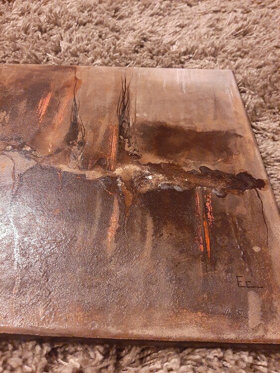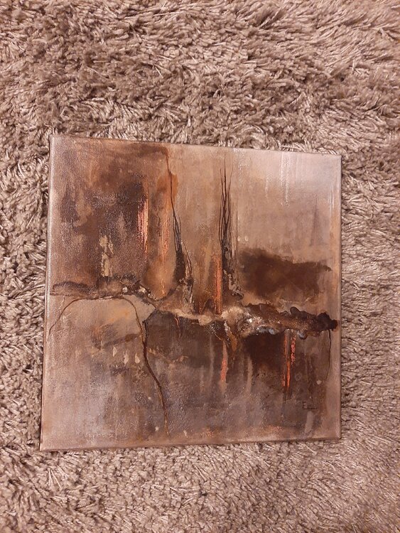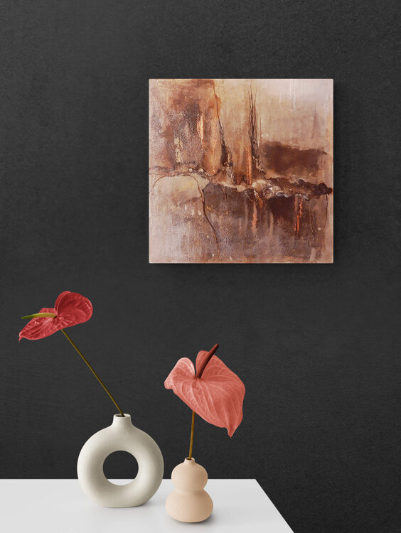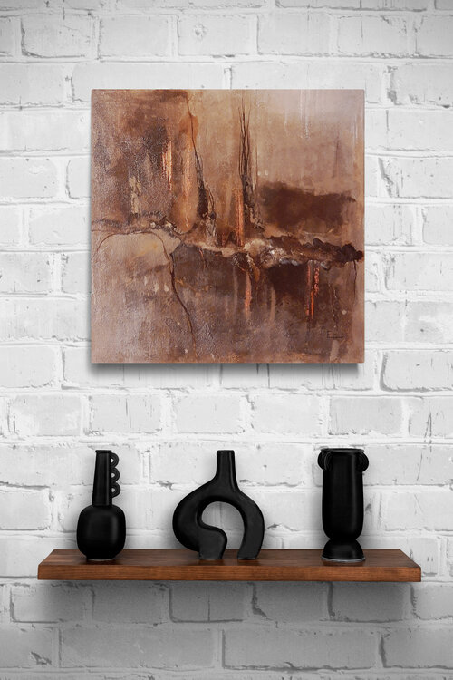 Composition aux couleurs de l'automne: rouille, marron, orangé, cuivre et crème... Les lignes et les couleurs se mélangent pour former un tout. Peinture intuitive, les yeux de ceux qui la contemplent y verront très probablement des images différentes, c'est le pouvoir de l'art...