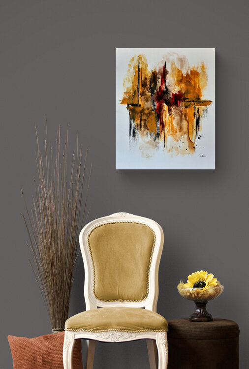 Tableau abstrait où les couleurs se mélangent pour ne former qu'un tout... Chaleureuse et contemporaine, dynamique et inspirante, l'artiste a écrit ses émotions de l'instant... Dans l'ombre, la lumière, l'espoir. Le centre incandescent nous rappelle que la flamme existe, toujours...