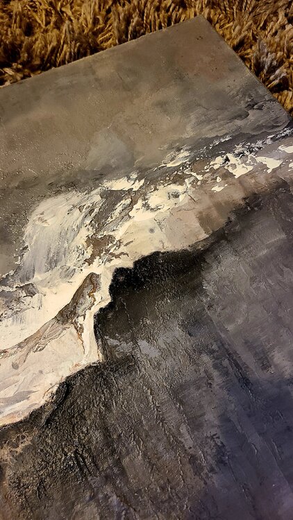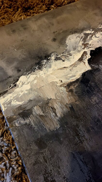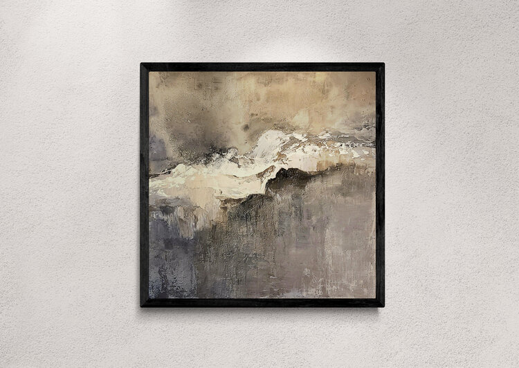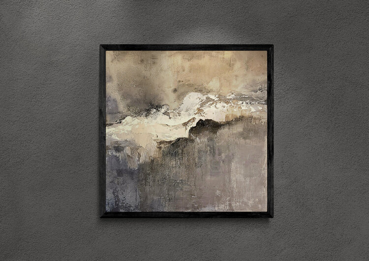 Entre montagnes et mer, cette œuvre mélancolique invite à la contemplation. L'artiste a mélangé les techniques et à peint cette toile exclusivement au couteau. Quant aux textures, elles apparaissent grâce à sa technique qui lui est propre.