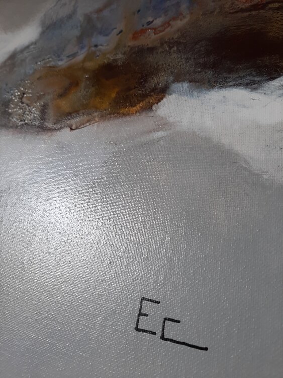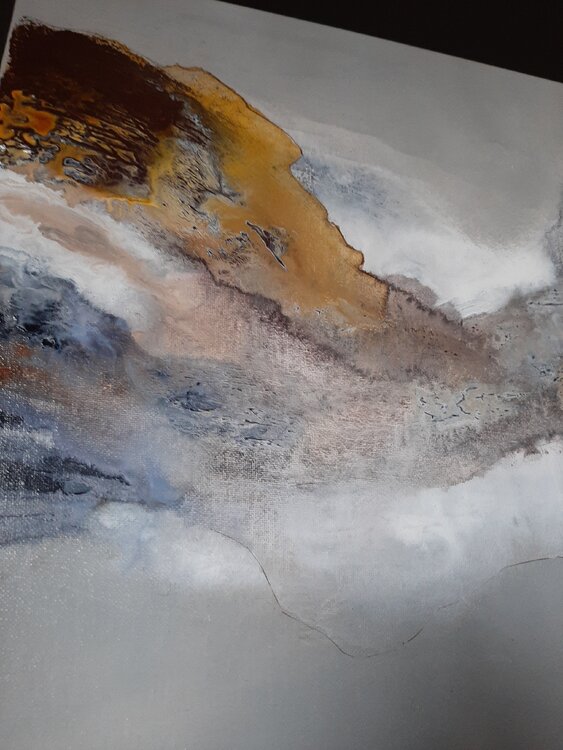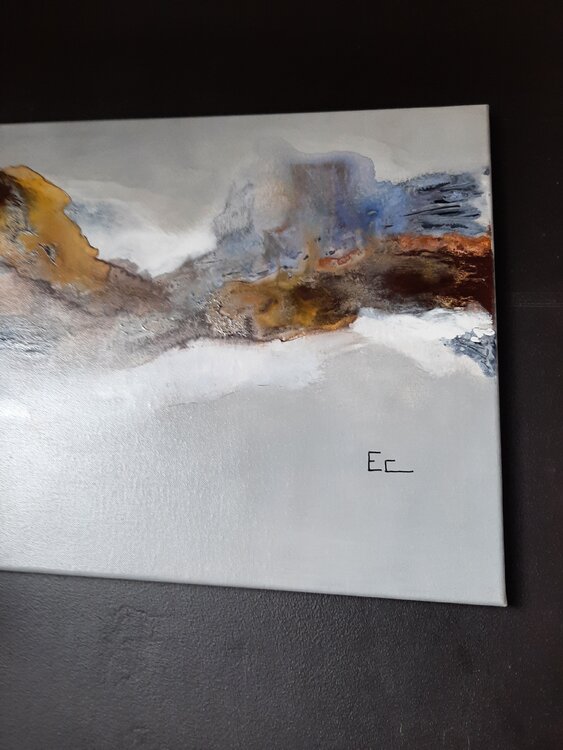 Comme "Vague", l'artiste s'est inspirée de la nature et de l'eau pour créer ce tableau abstrait où se mélangent les couleurs gris de Payne, terre de Sienne, terre d'Ombre brûlée et blanc. On peut également voir une teinte jaunâtre et du bleu sous l'effet du mélange couleurs-eau. Tableau signé au dos.