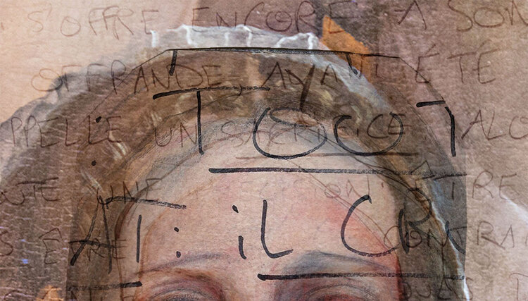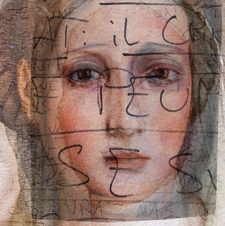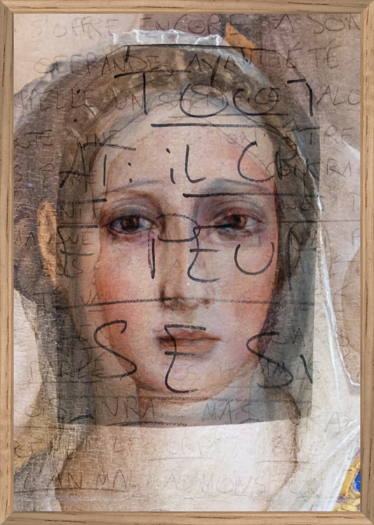 Cette impression sur alu dibond est un mix entre l’un de mes poèmes écrit au marqueur, une étude pour « Les Corps Glorieux » et un portrait réalisé par Il Bronzino, peintre de la Renaissance italienne du XVIème siècle.