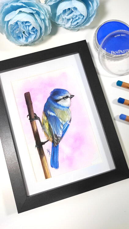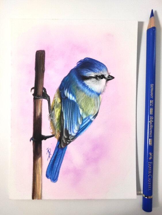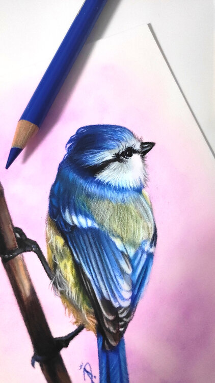 Une belle mésange bleue dessinée au pastel. Le fond a été créé à l’aquarelle.