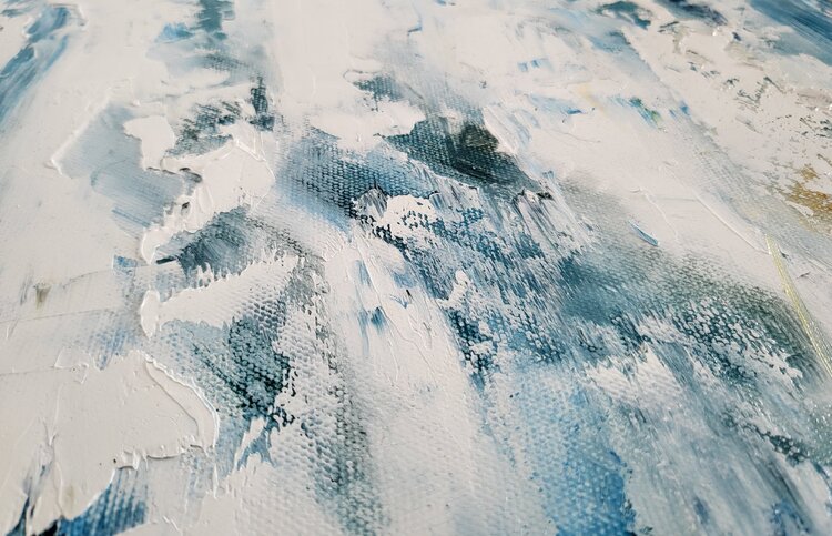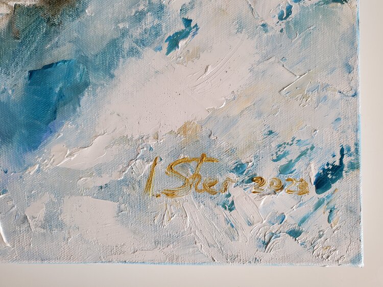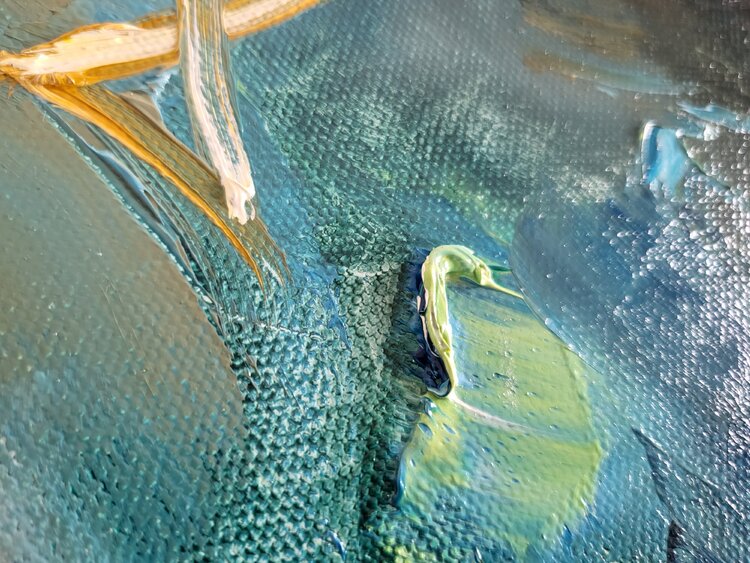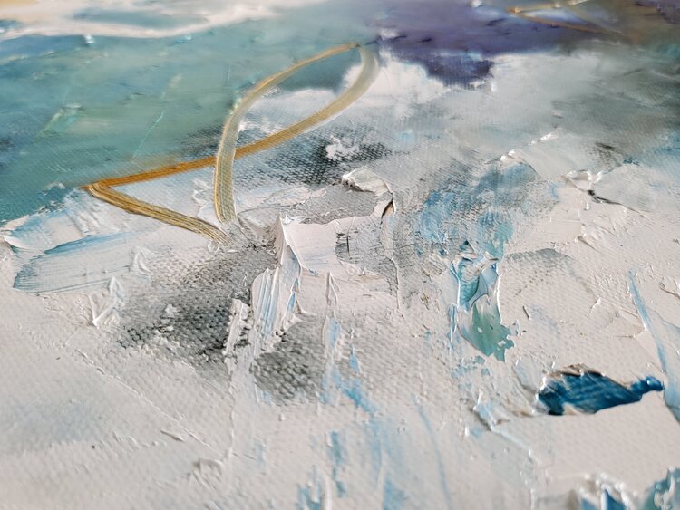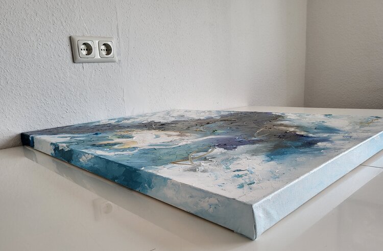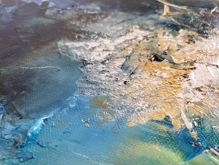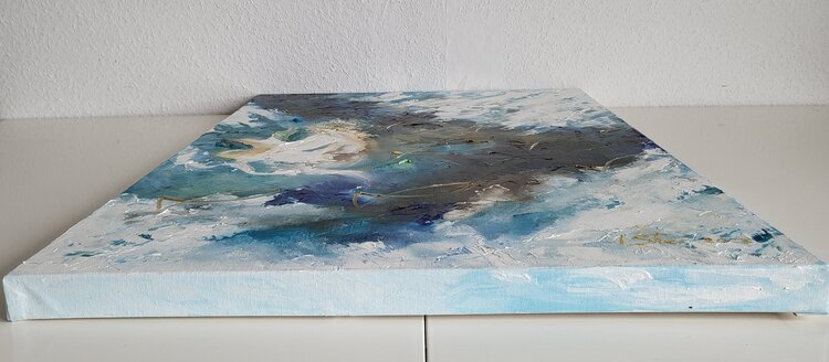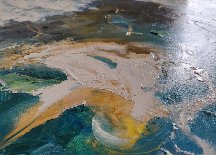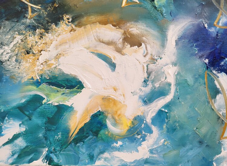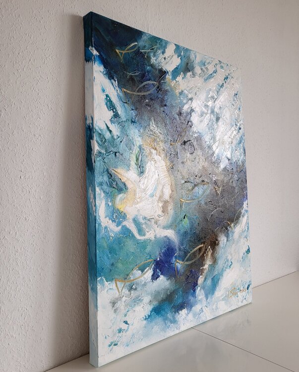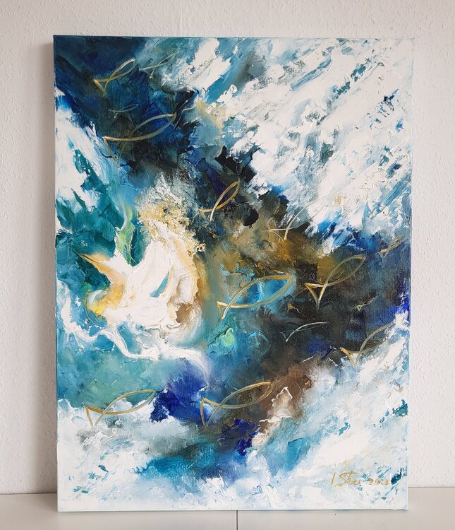 Des éclaboussures d'eau, des vagues éclatantes, une tempête dynamique de fraîcheur et de beauté. Peinture énergisante et relaxante. Ce tableau montre des cours d'eau. La profondeur de l'océan et les poissons qui coulent à contre-courant vers la source d'eau vive. Le poisson en tant que symbole du christianisme symbolise Jésus-Christ et ses disciples. Matthieu et Marc racontent que Jésus a promis à Pierre et André de faire d'eux des "pêcheurs d'hommes",1