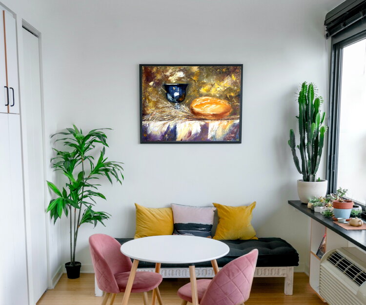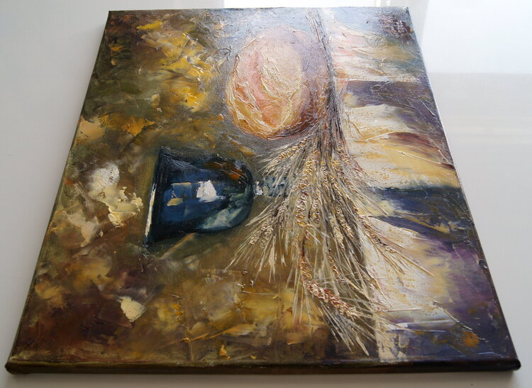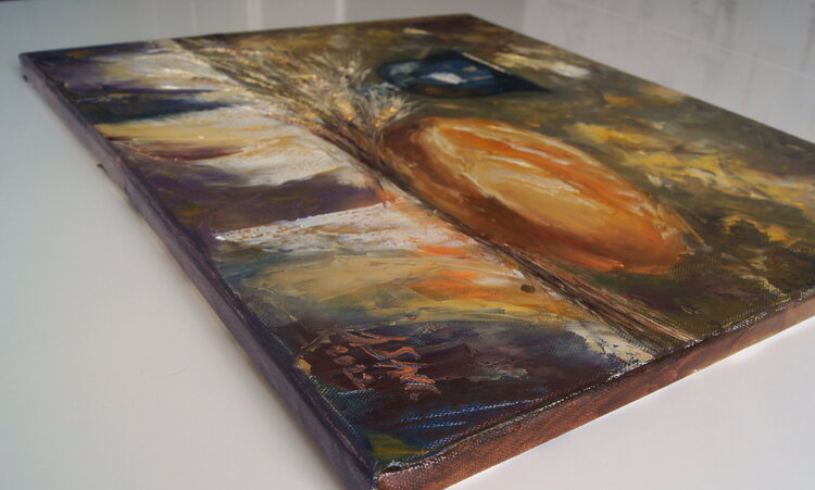 Cette belle peinture colorée est une nature morte de pain et de vin qui dégagent des parfums. Le travail a été fait avec un couteau à palette et un pinceau. Ainsi, la surface est toujours très différente de lisse à rugueuse.