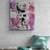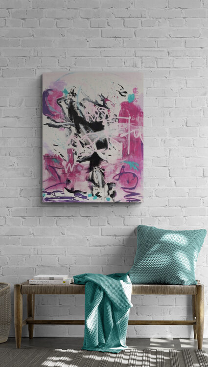 Une peinture abstraite énergique avec un centre noir avec des coups de pinceau sauvages blancs et rouge-violet, rose pastel et turquoise.