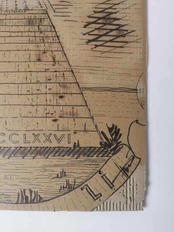 Oeuvre sur carton ondulé recyclé, feutre, pyrogravure et brûlé au chalumeau.