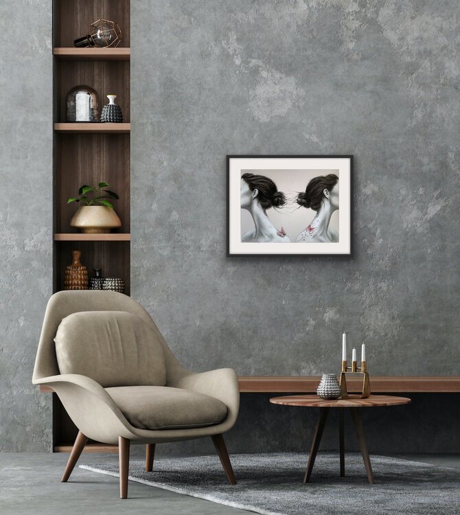 A travers cette peinture de femmes avec des papillons sur papier l'artiste veut représenter deux esprits, l'un qui pense et l'autre qui ressent, un entrelacement naturel d'émotions, d'attractions fortes et légères, qui demandent du temps pour être véritablement vécues, mais le temps est éphémère comment La vie d'un papillon est éphémère.