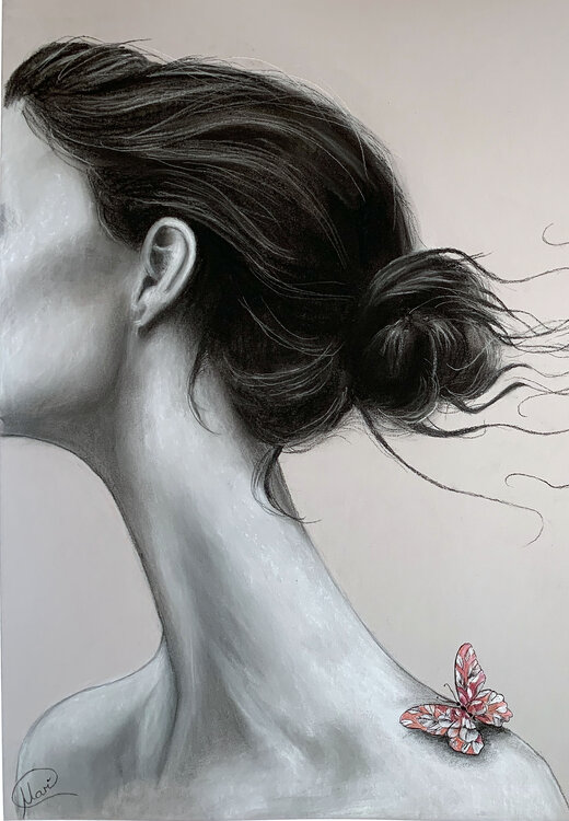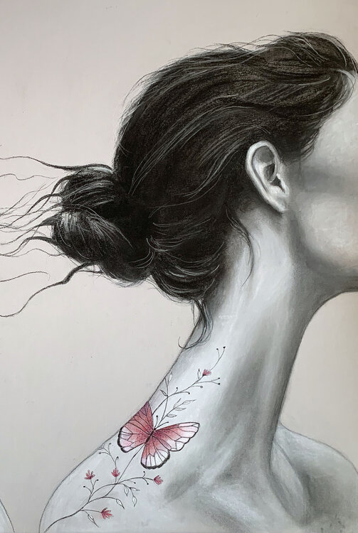 Ce tableau a été réalisé avec des pastels secs et des tatouages de papillons réalisés à l'encre.