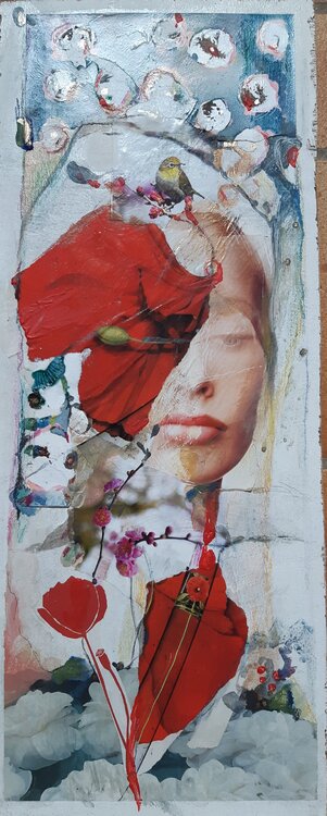 Dans cette composition énigmatique sur bois, le portrait se révèle comme un ballet entre mystère et dévoilements. Les techniques mixtes et le collage ajoutent une profondeur tactile à l'œuvre, chaque élément contribuant à la narration visuelle.